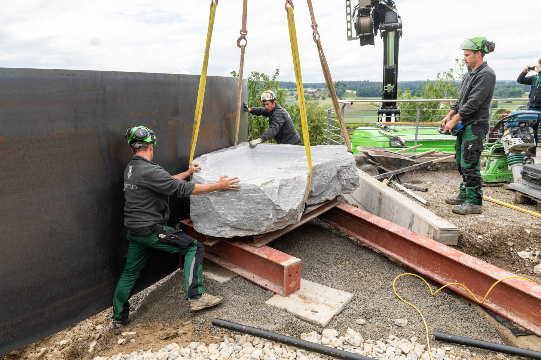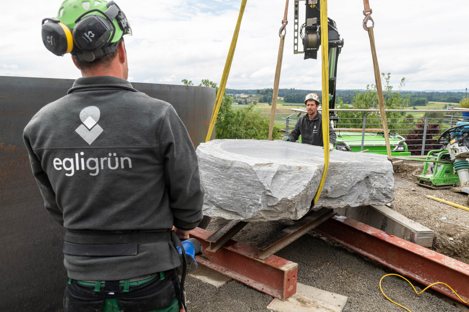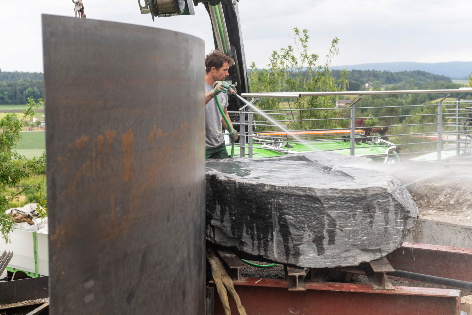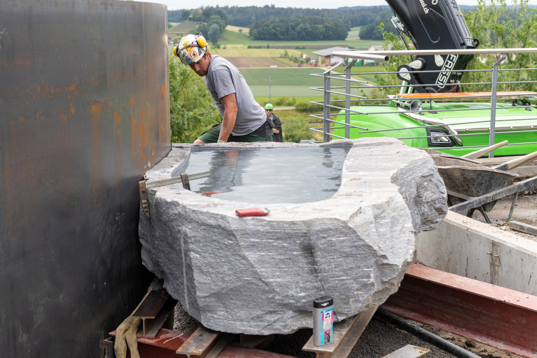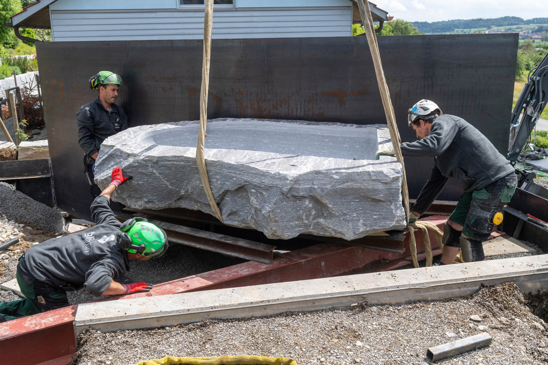 Der Brunnen wird platziert – ein wunderschönes Stück Calanca Gneis.