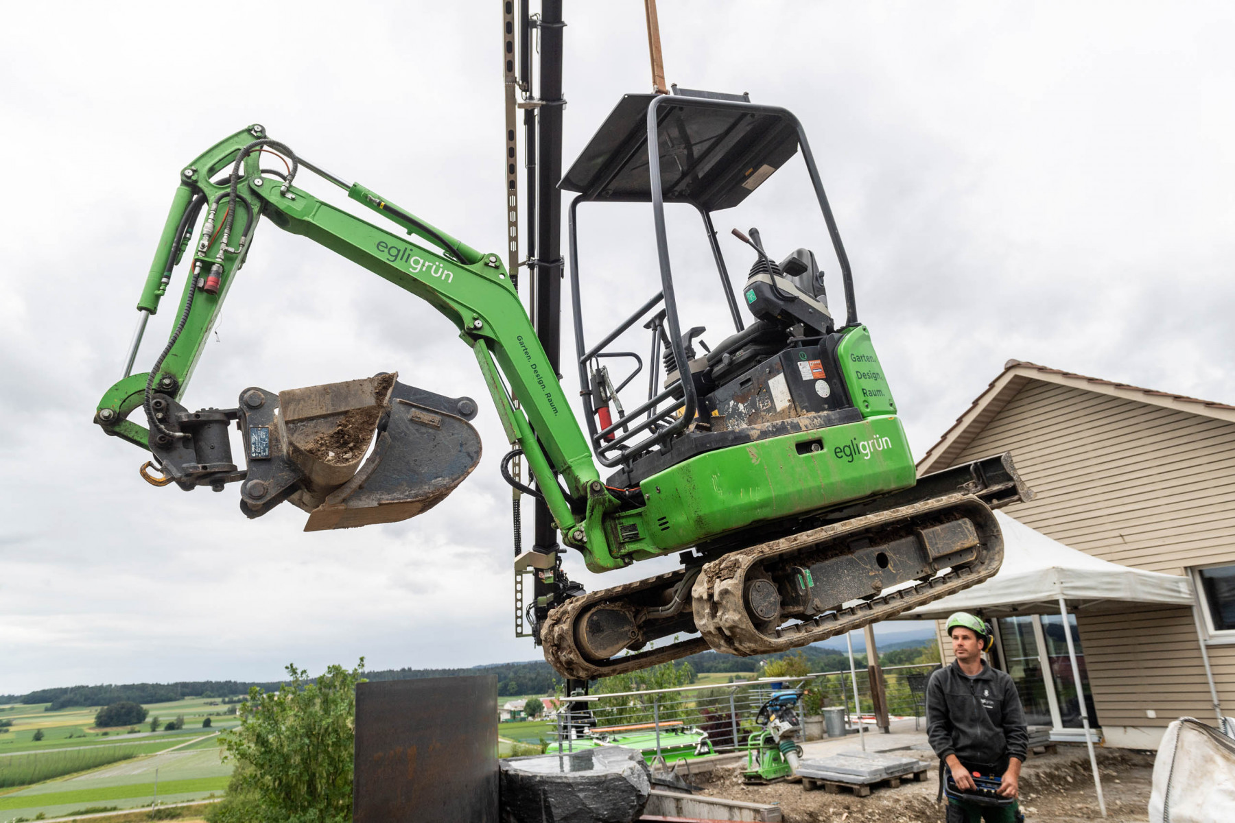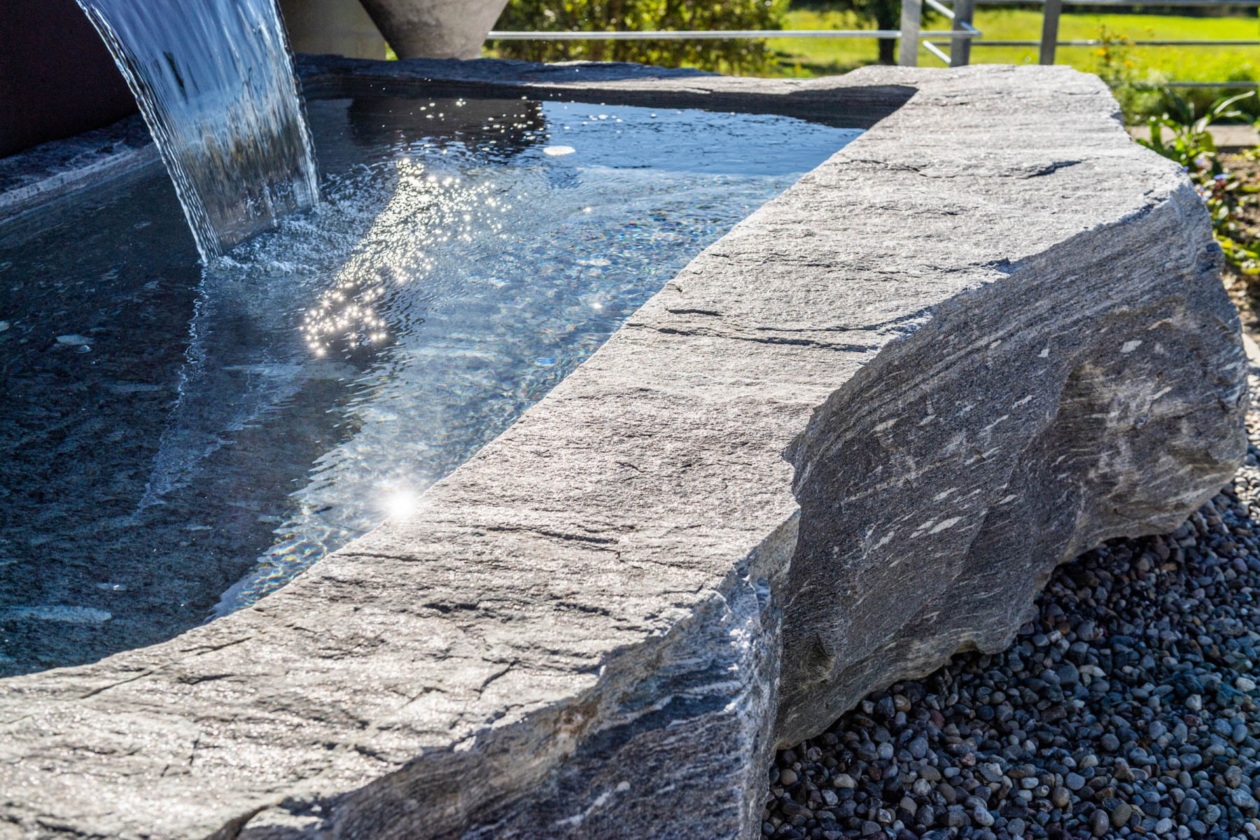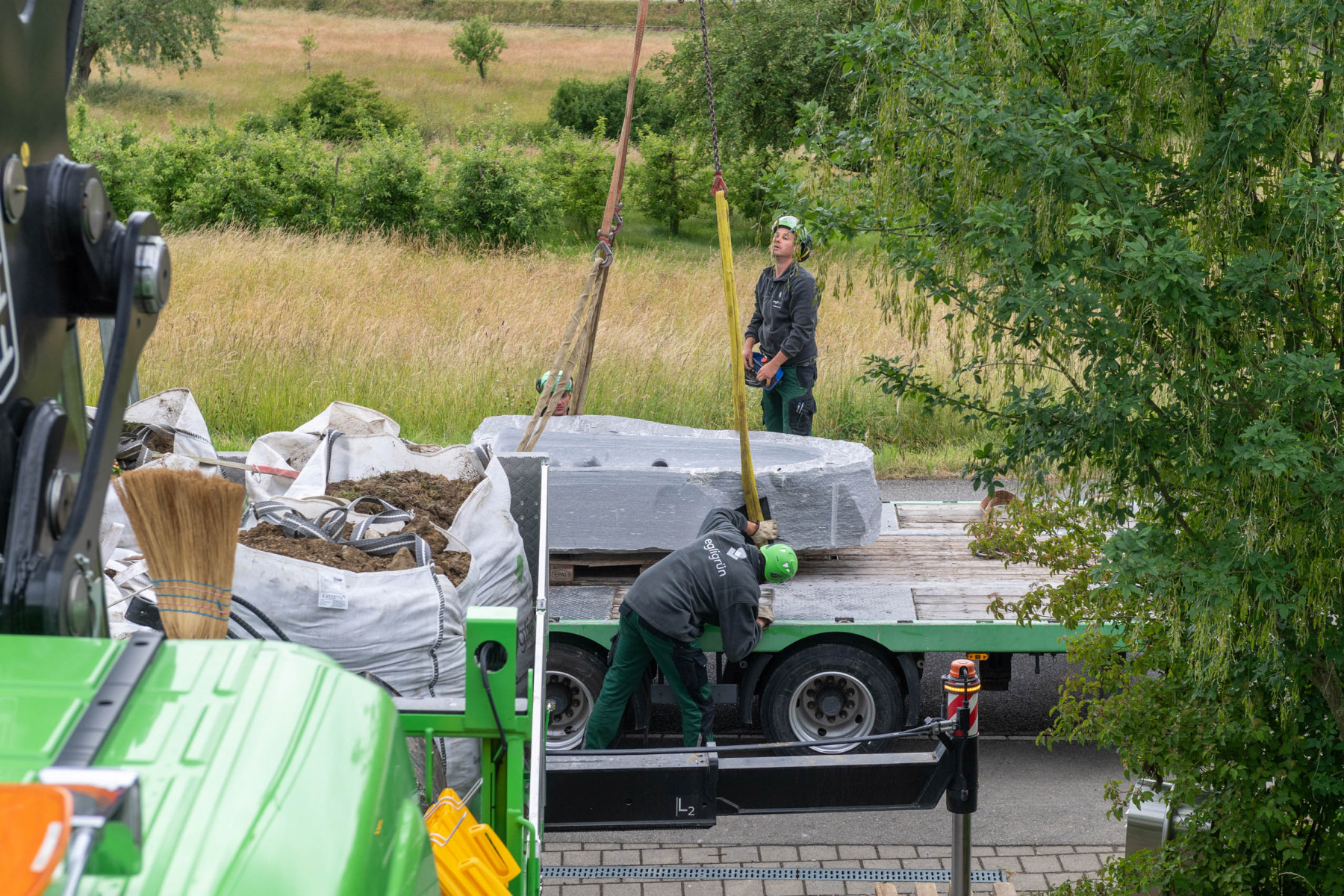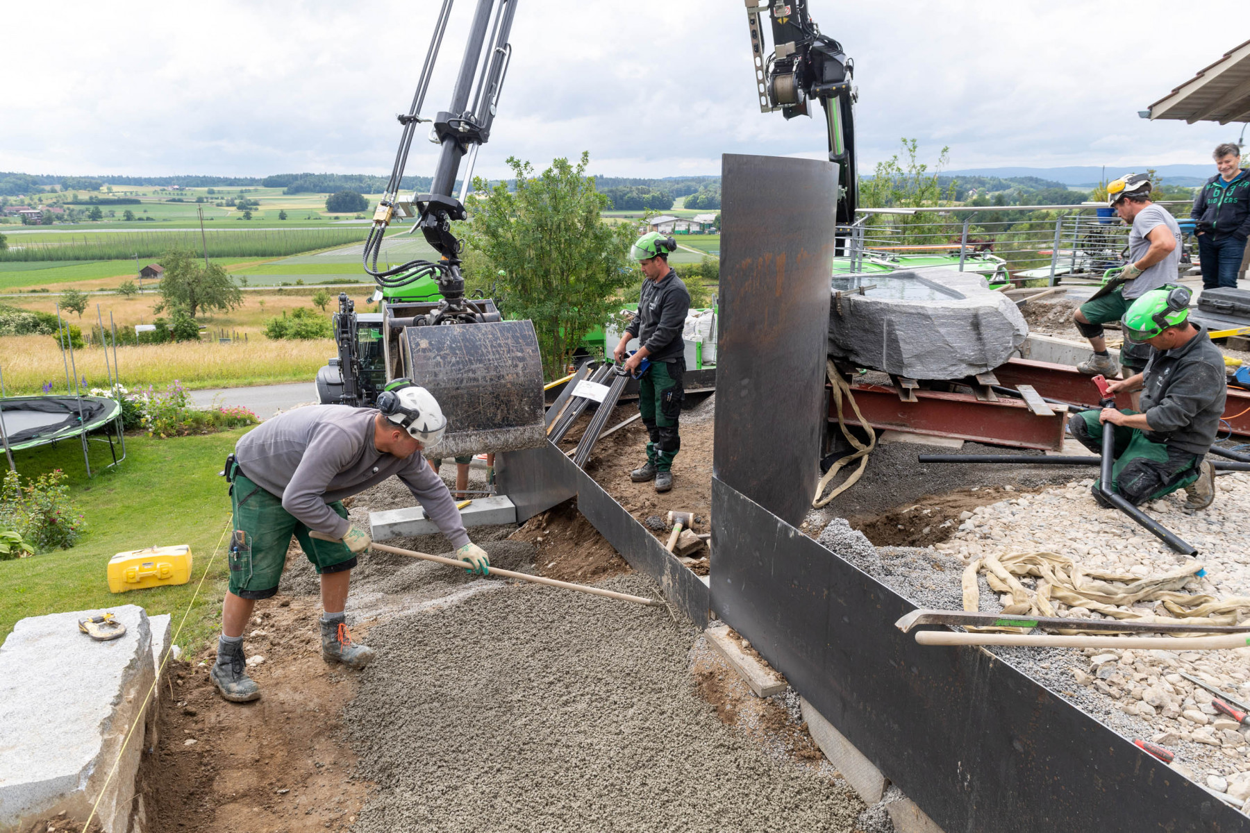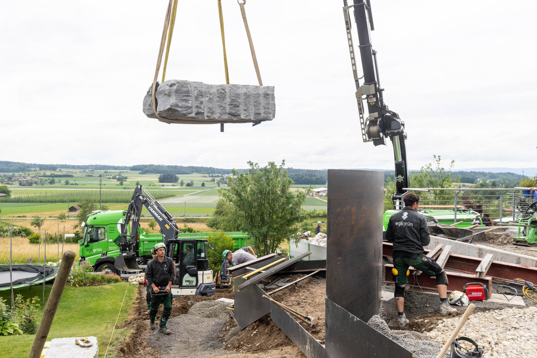 Der Brunnen wird platziert – ein wunderschönes Stück Calanca Gneis.
