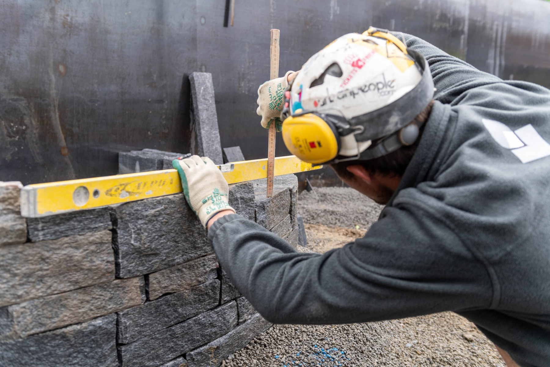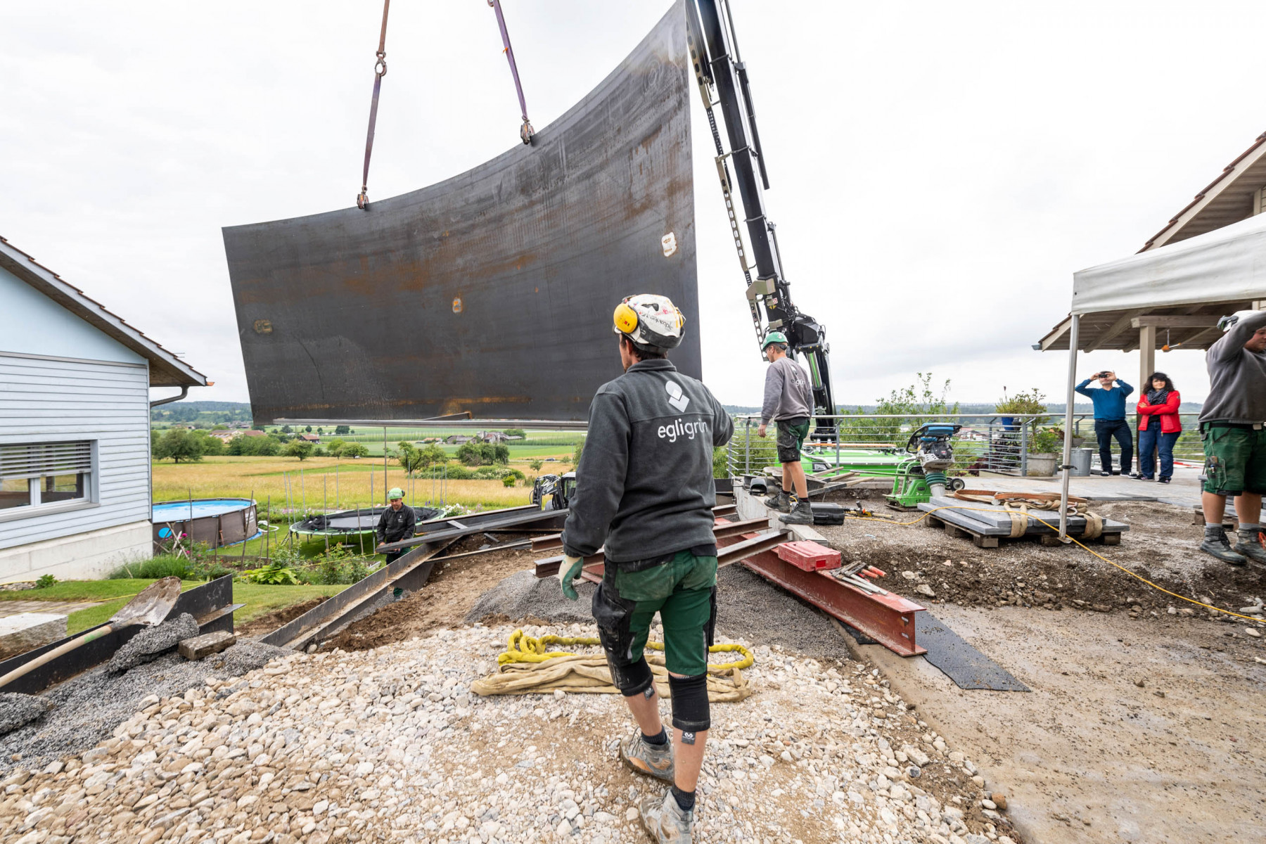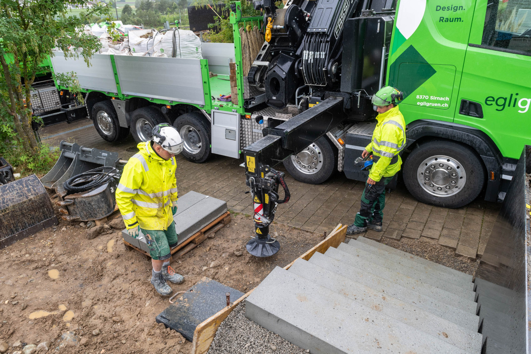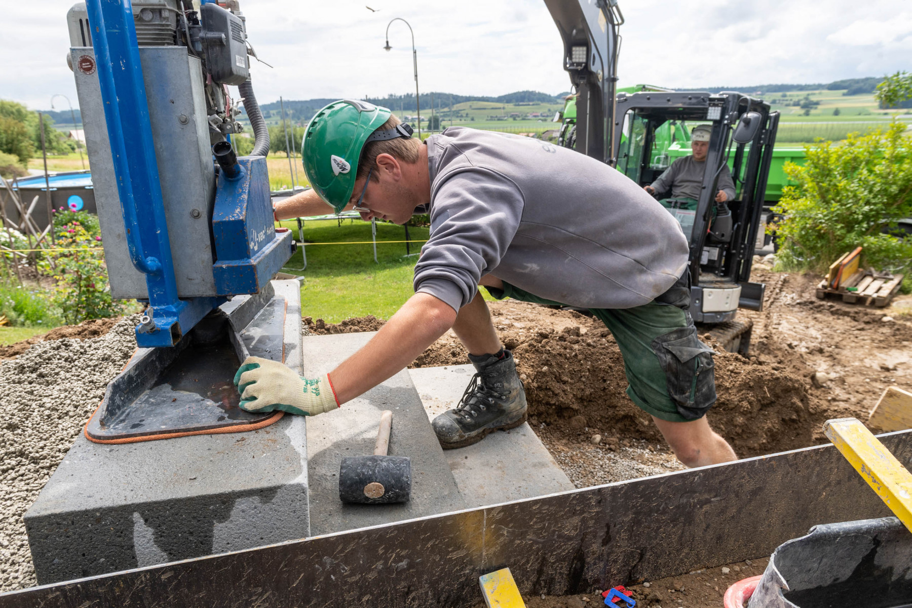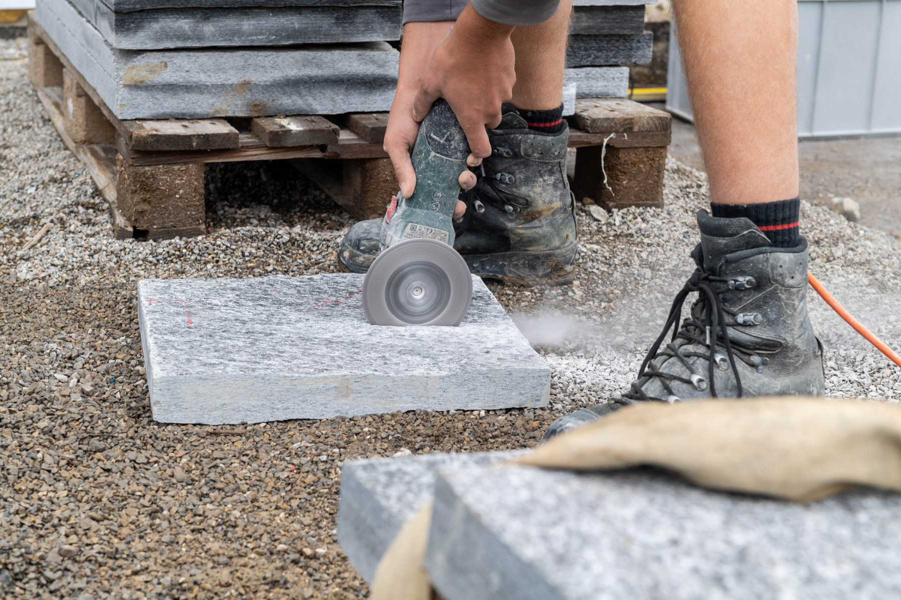 Der Brunnen wird platziert – ein wunderschönes Stück Calanca Gneis.