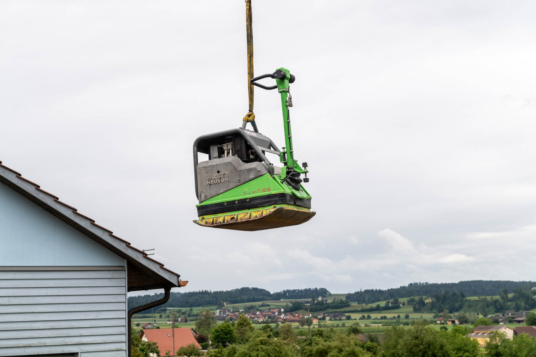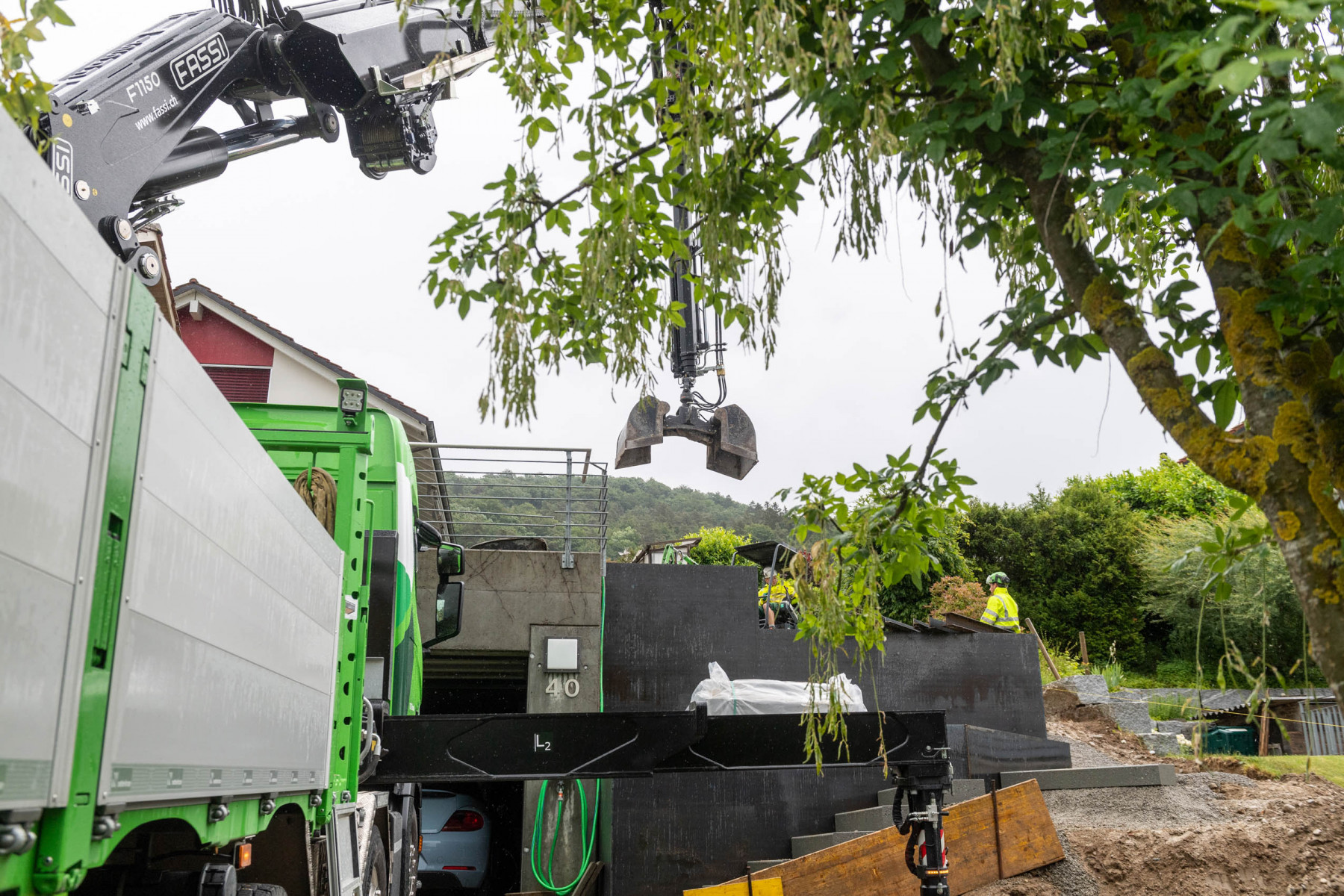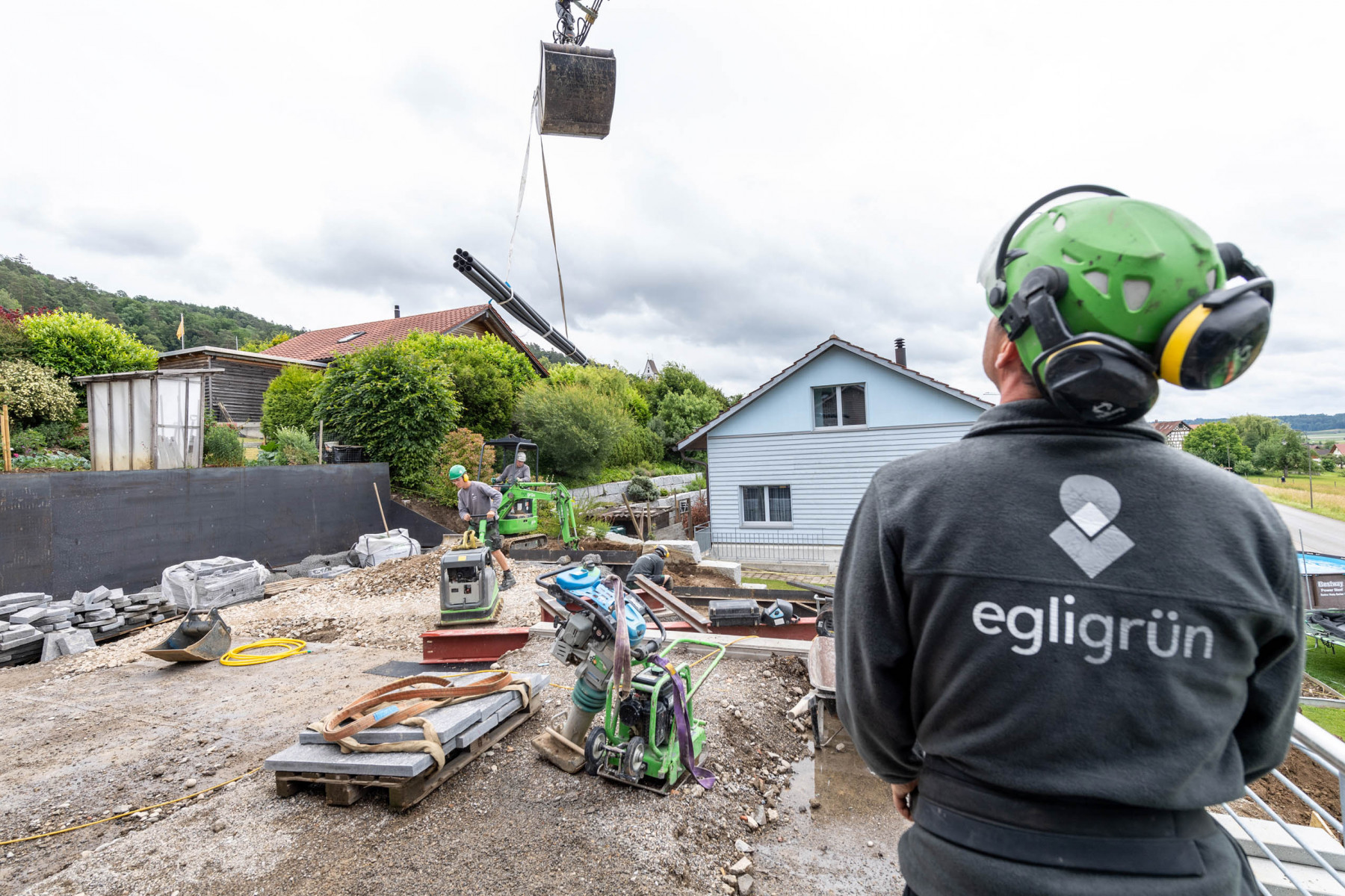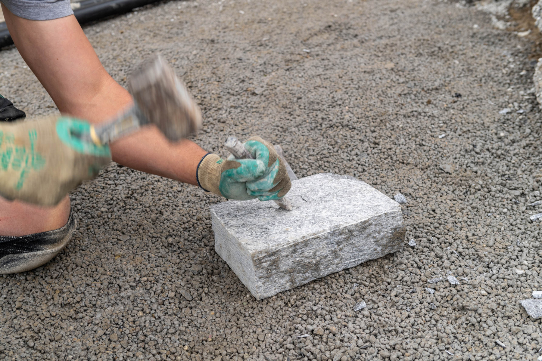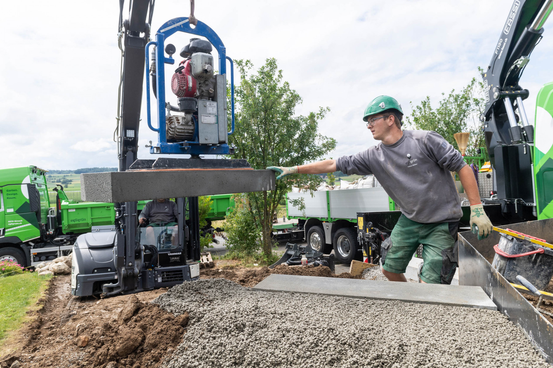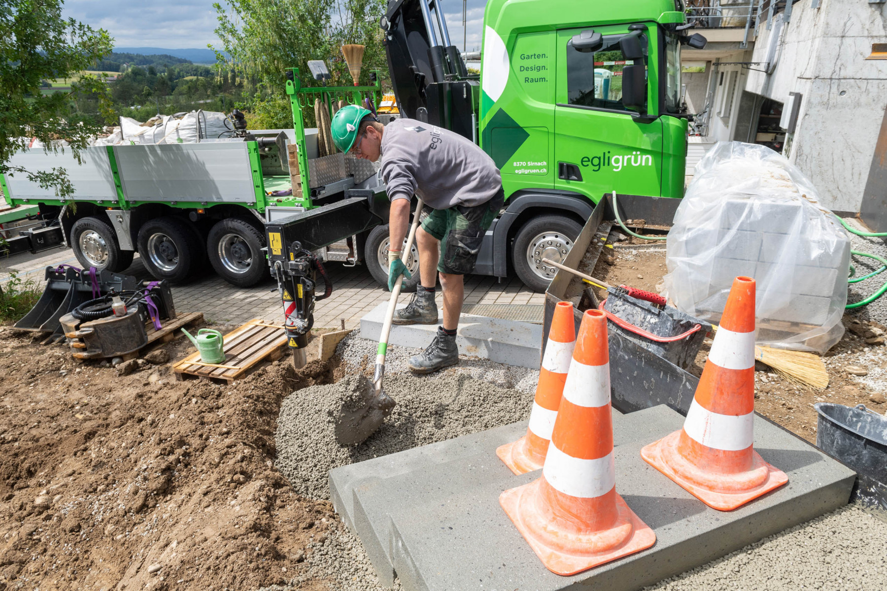 Der Brunnen wird platziert – ein wunderschönes Stück Calanca Gneis.