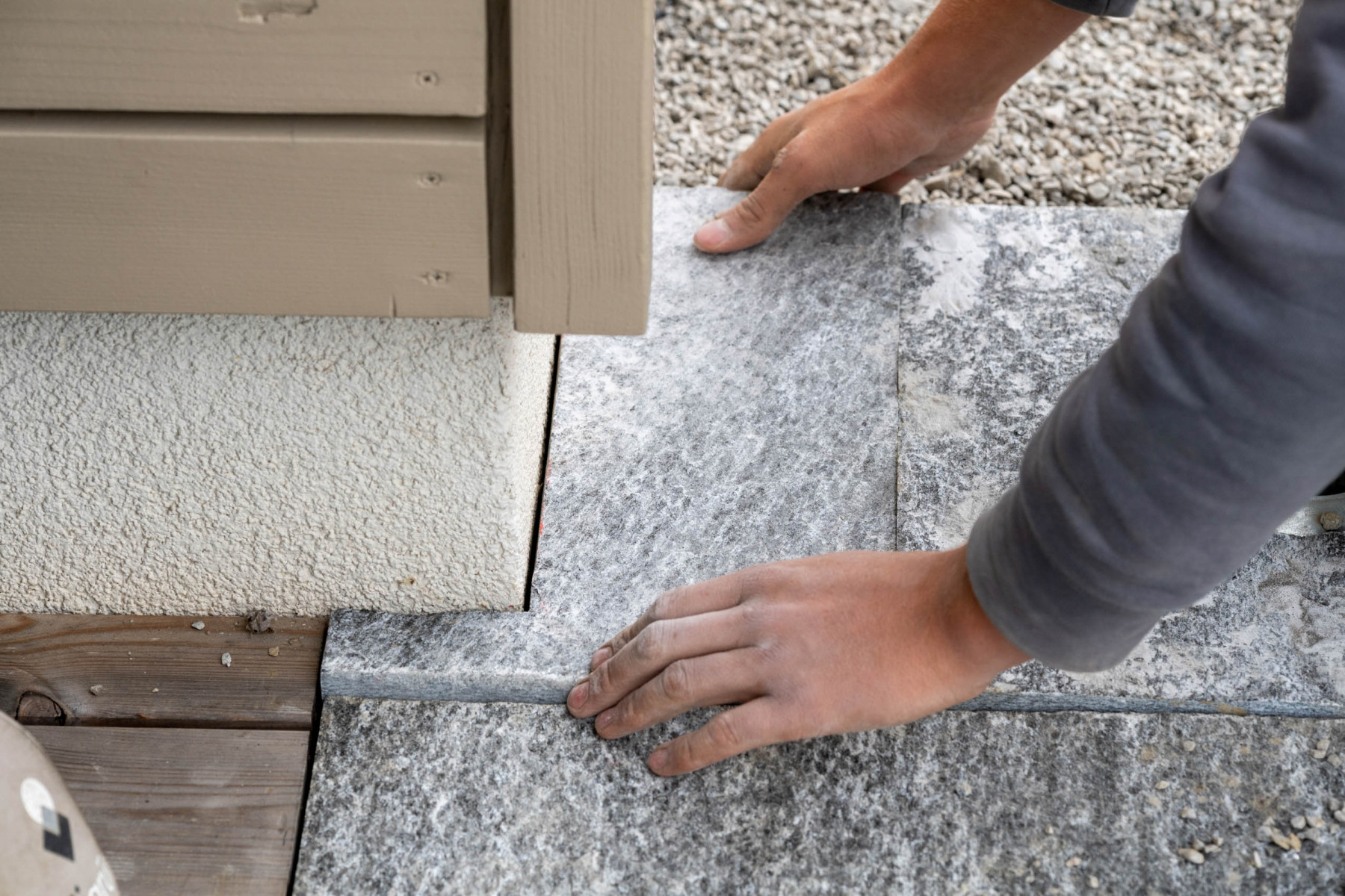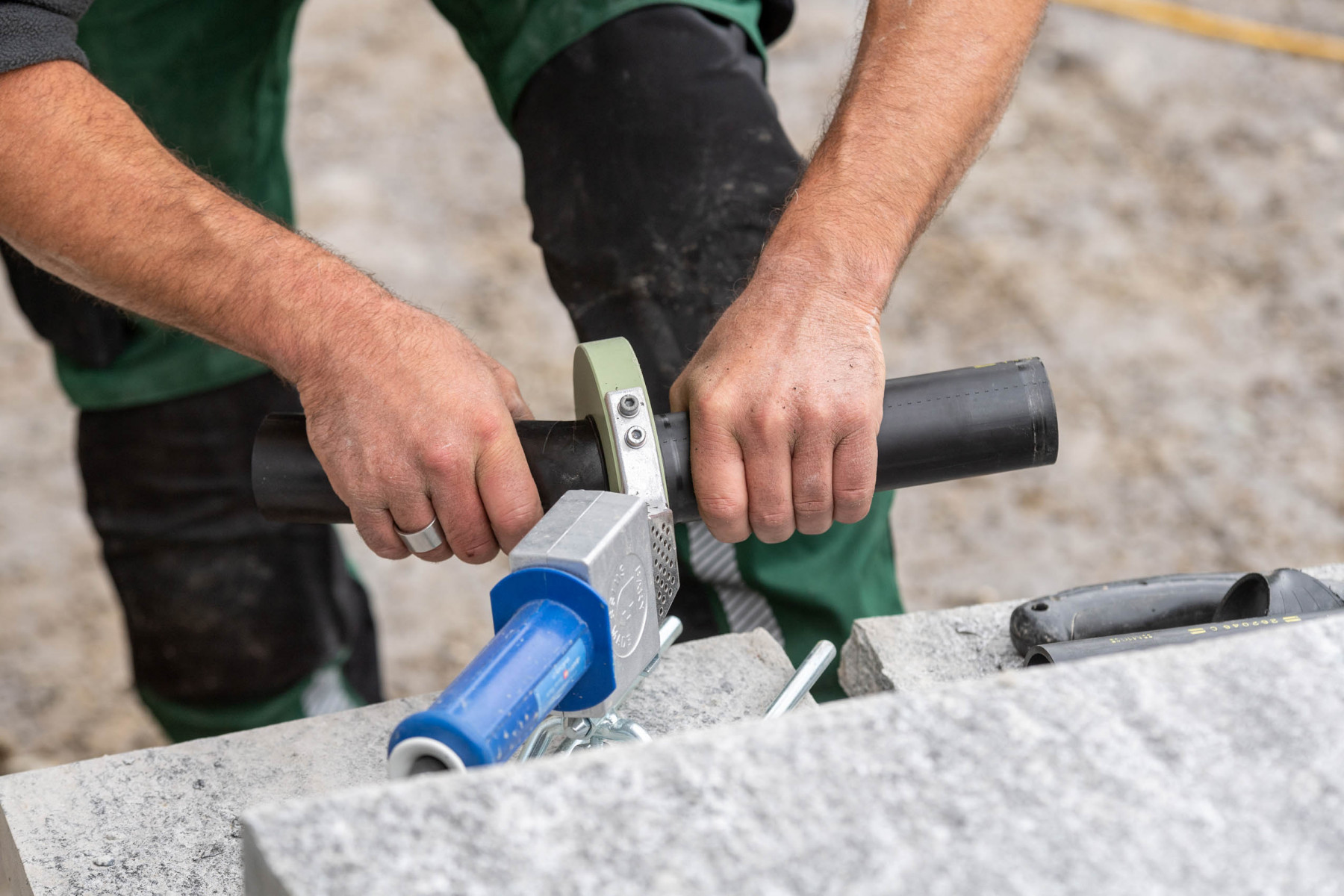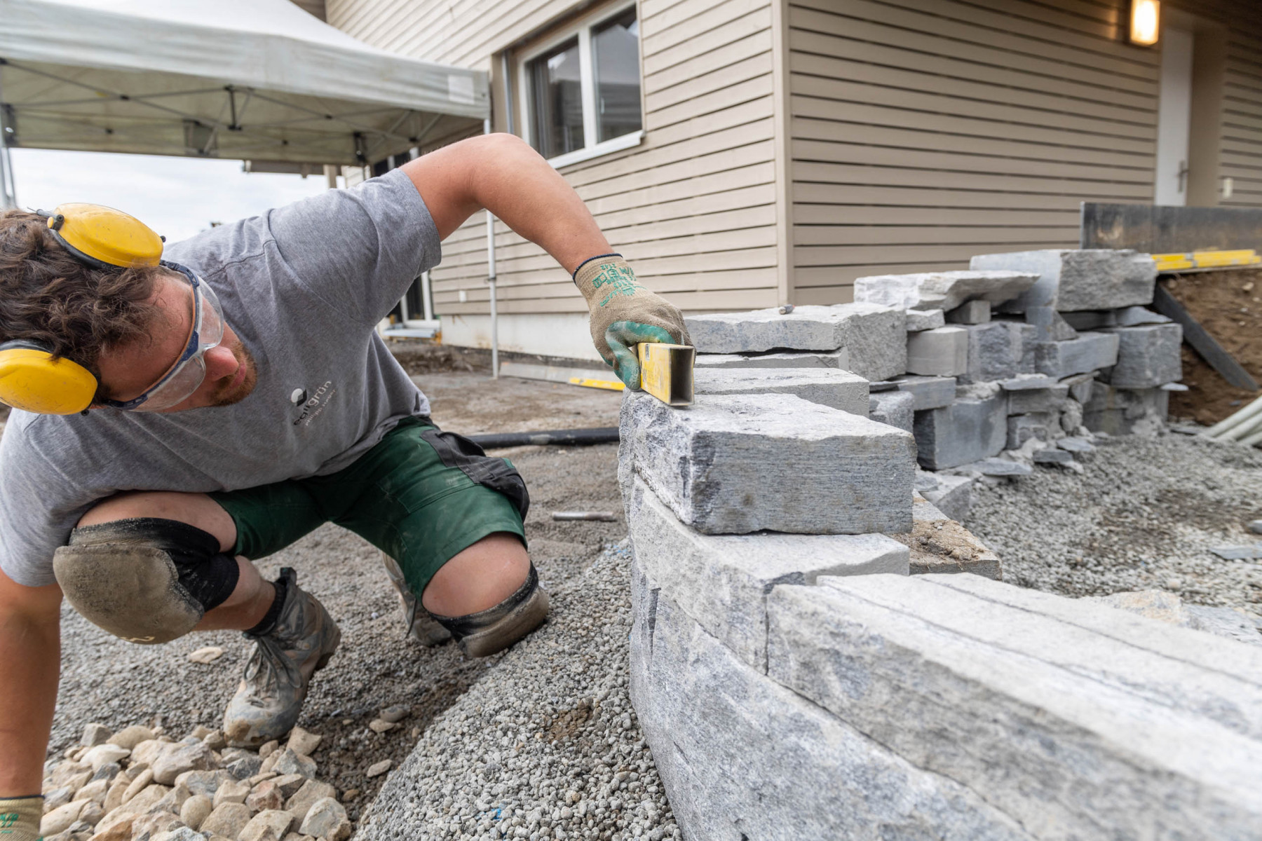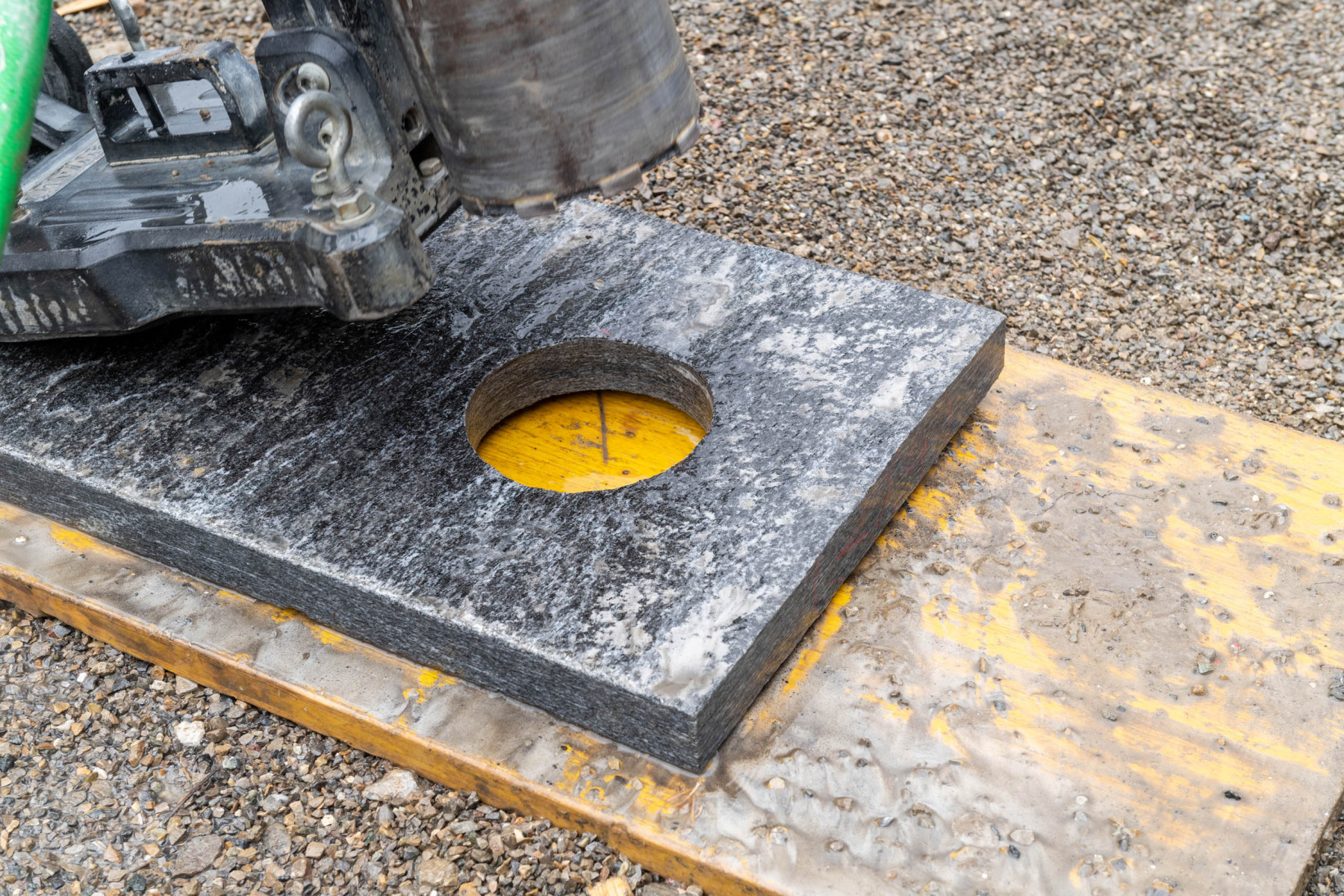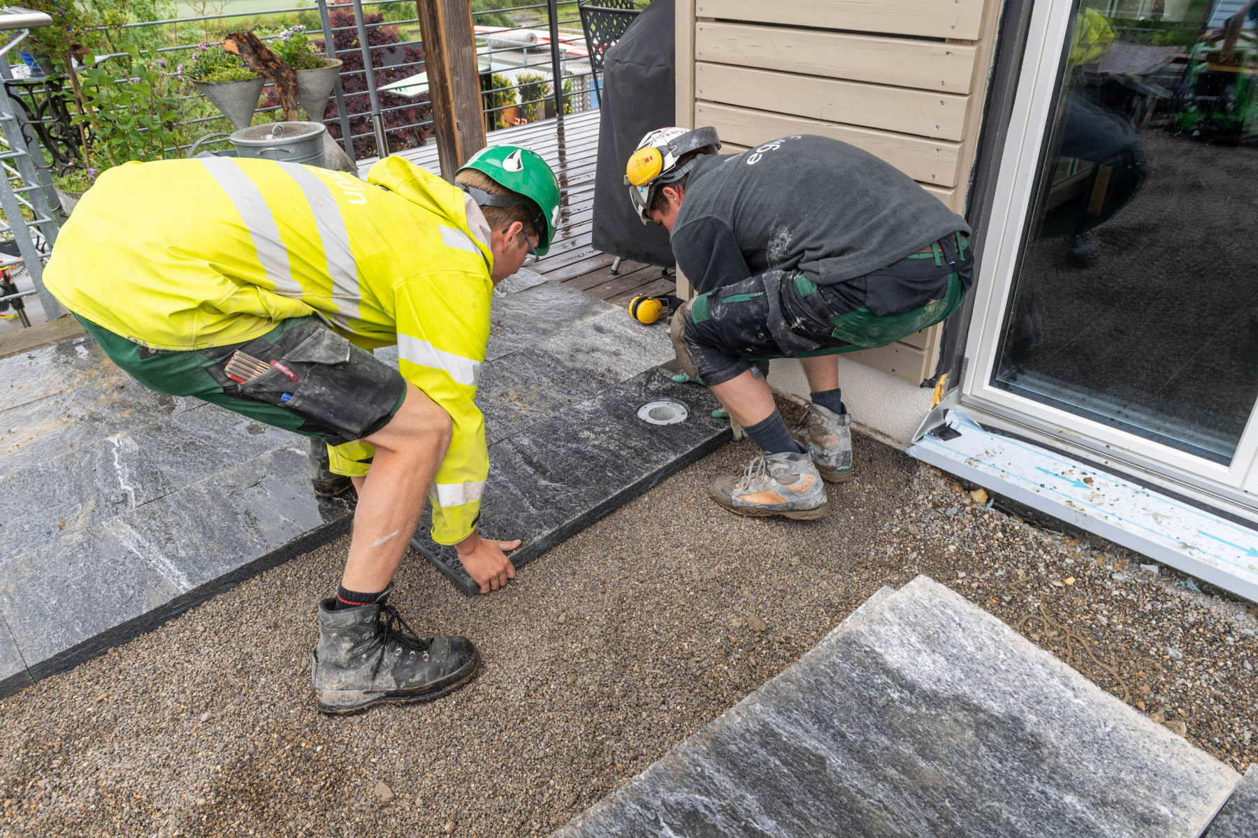 Der Brunnen wird platziert – ein wunderschönes Stück Calanca Gneis.