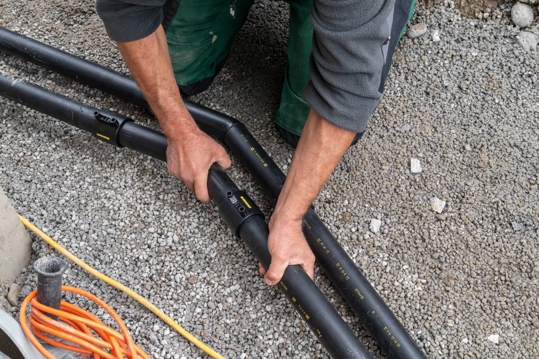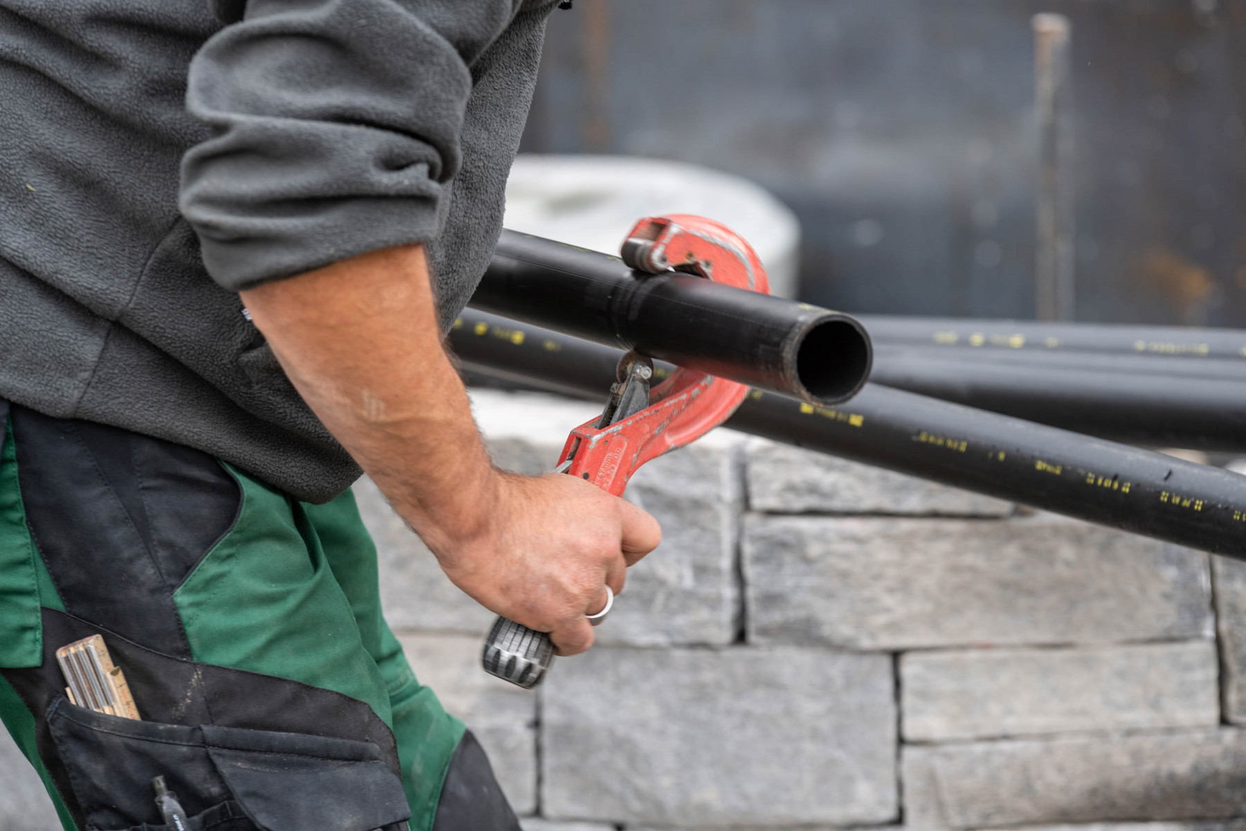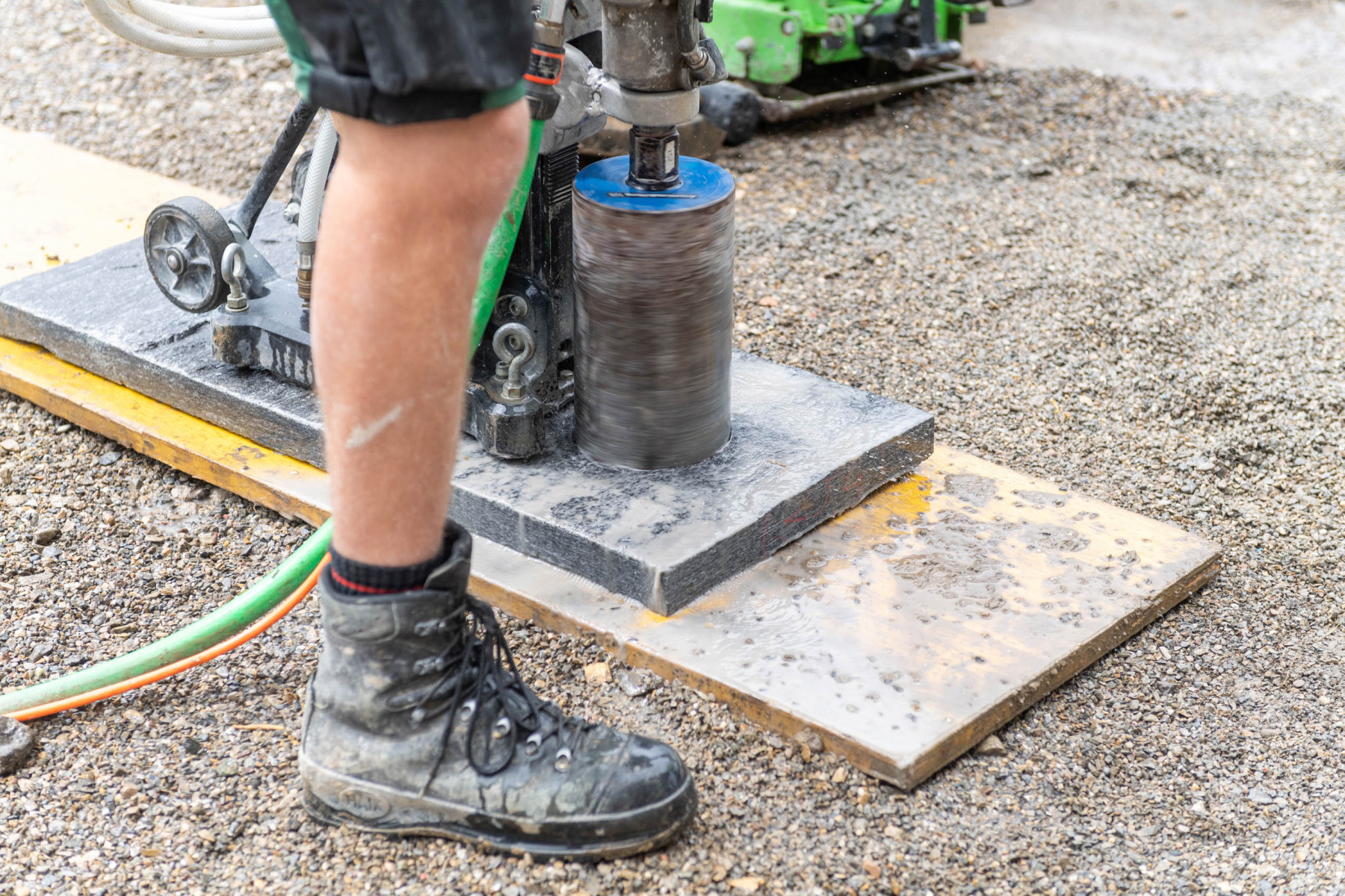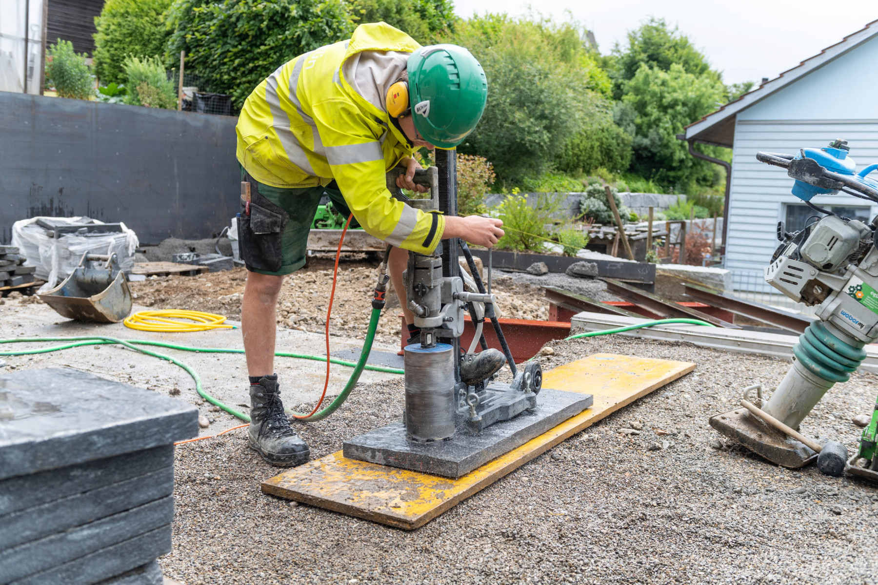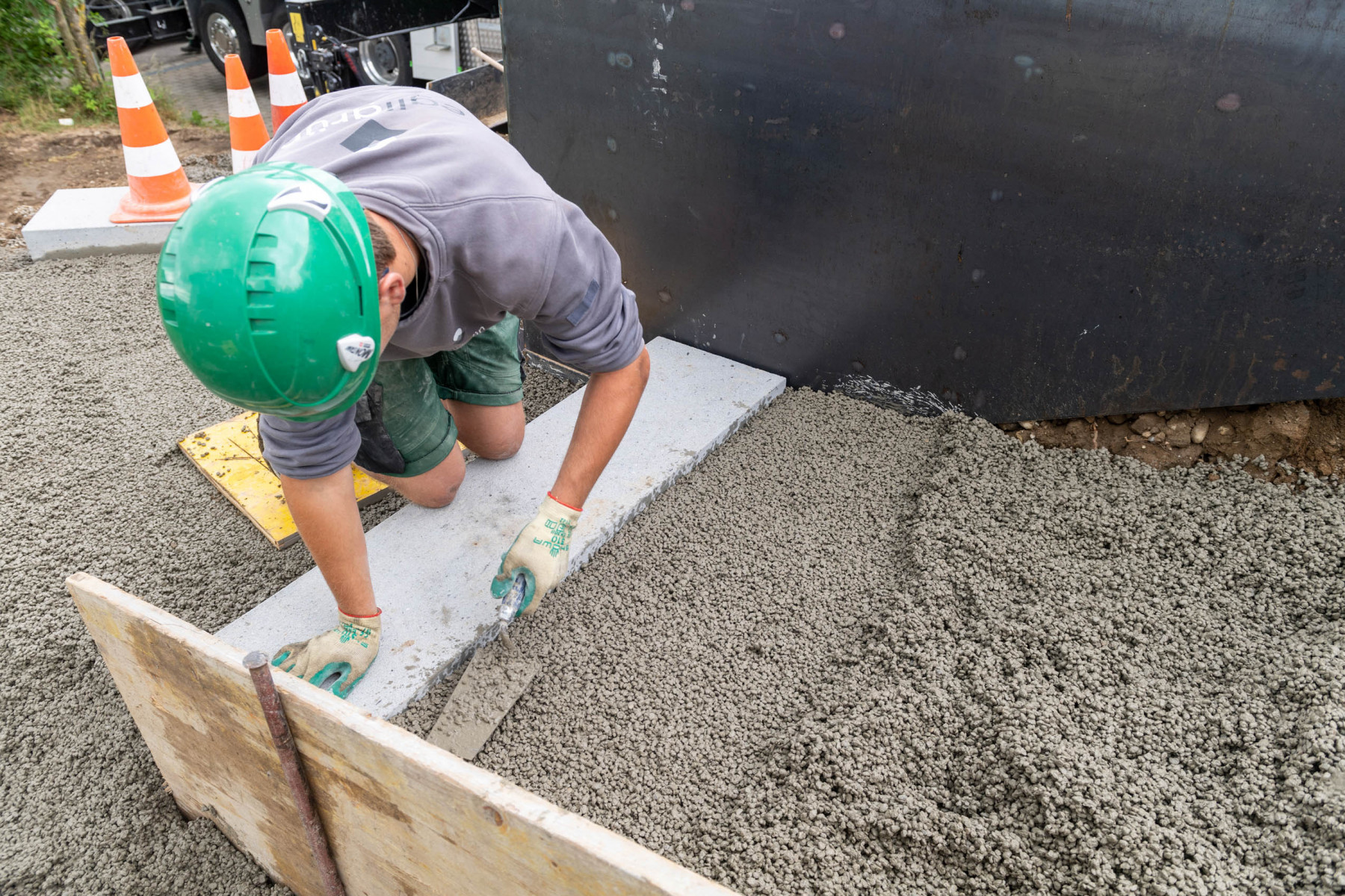 Der Brunnen wird platziert – ein wunderschönes Stück Calanca Gneis.