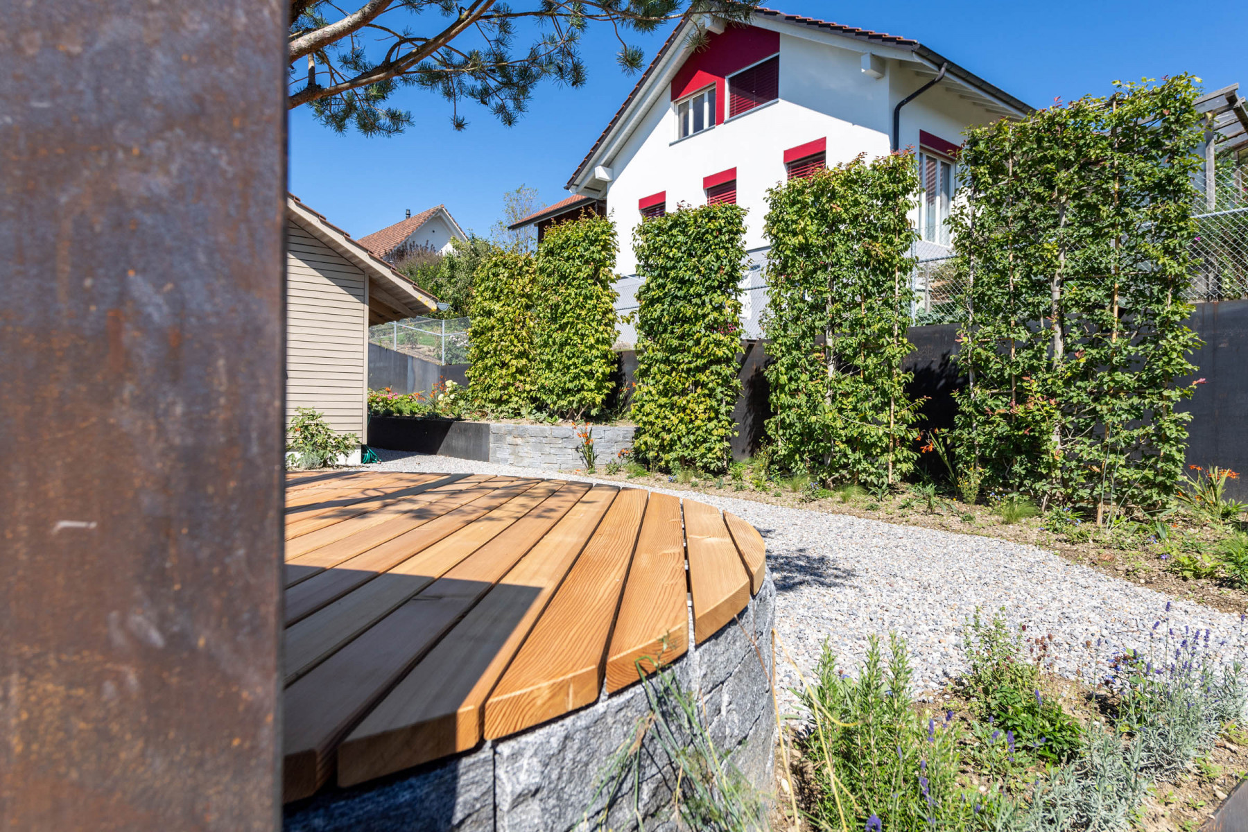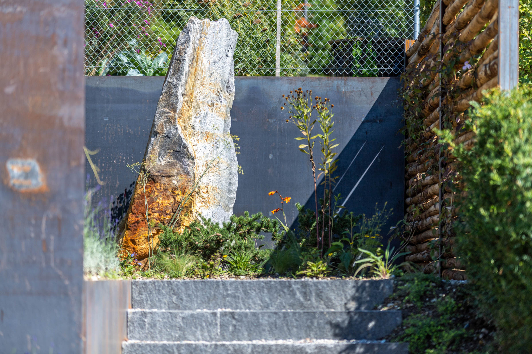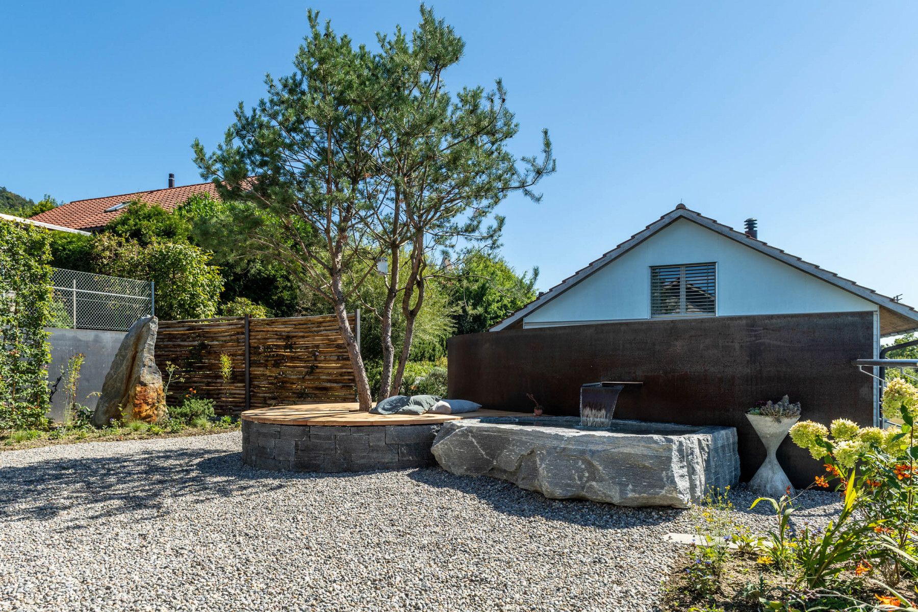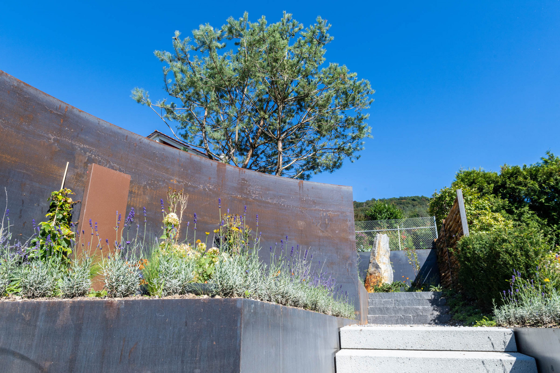 Eine Fertiggarage, an der westlichen Hausecke platziert, bietet Platz für das Bike-Hobby und obenauf entsteht ein grosszügiger Loungebereich mit toller Fernsicht. Der Hauszugang wird neu nach unten verlegt und dadurch kann die obere Ebene zu einem gemütliche Wohngarten mit Brunnen und Grillbereich gestaltet werden. Die steile Böschung an der Rückseite wird durch rohen Stahl in neue Ebenen unterteilt und pflegeleicht bepflanzt. Unterschiedliche Sichtschutzelemente sorgen für ein angenehmes Raumgefühl und verhelfen dem Garten zu wohliger Geborgenheit.