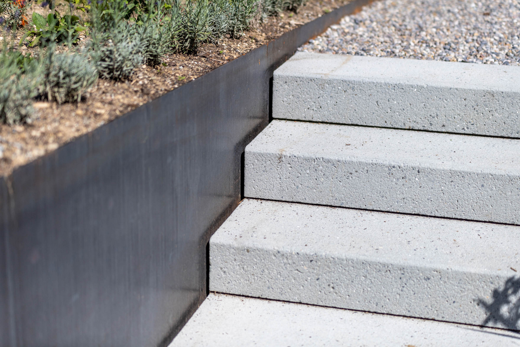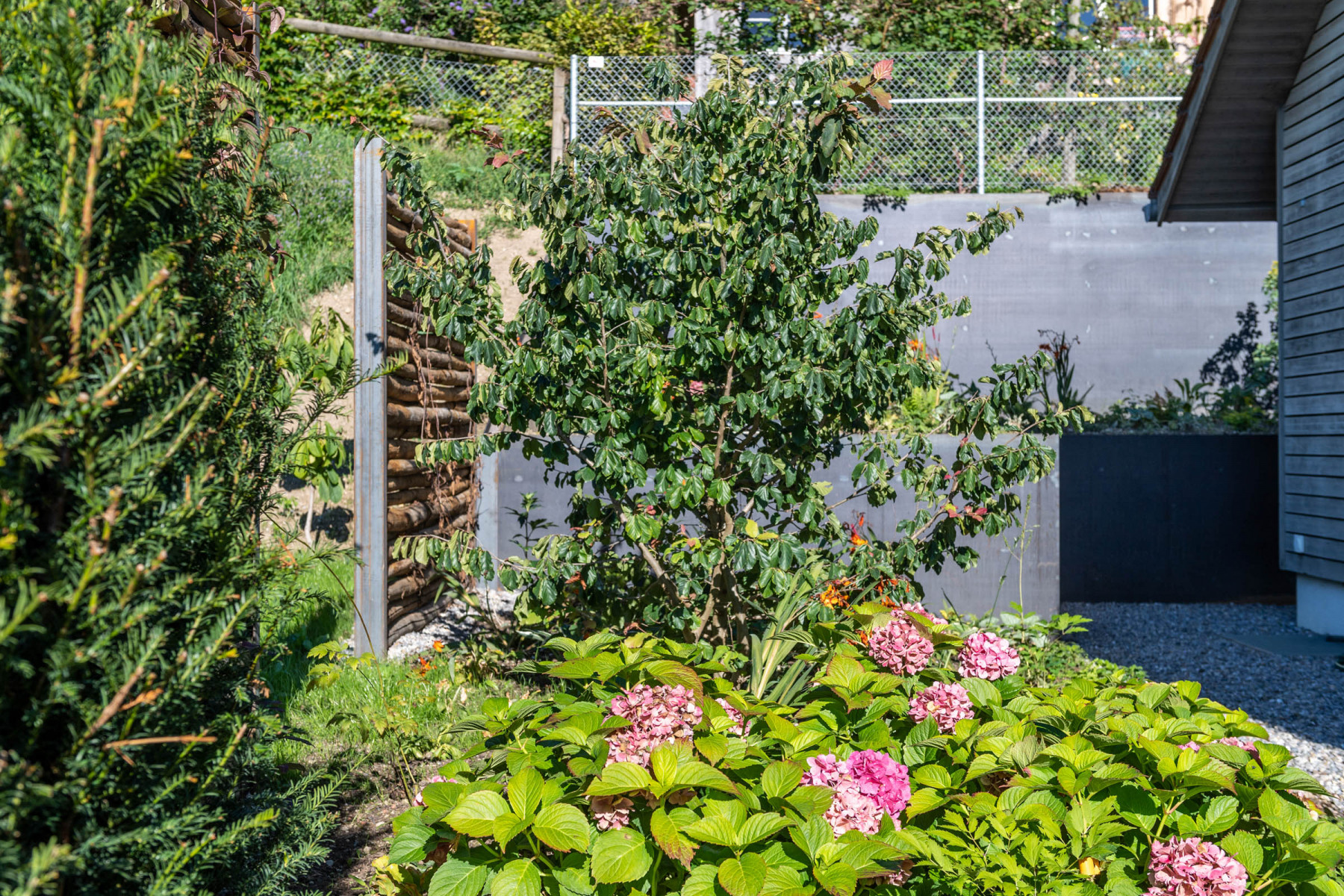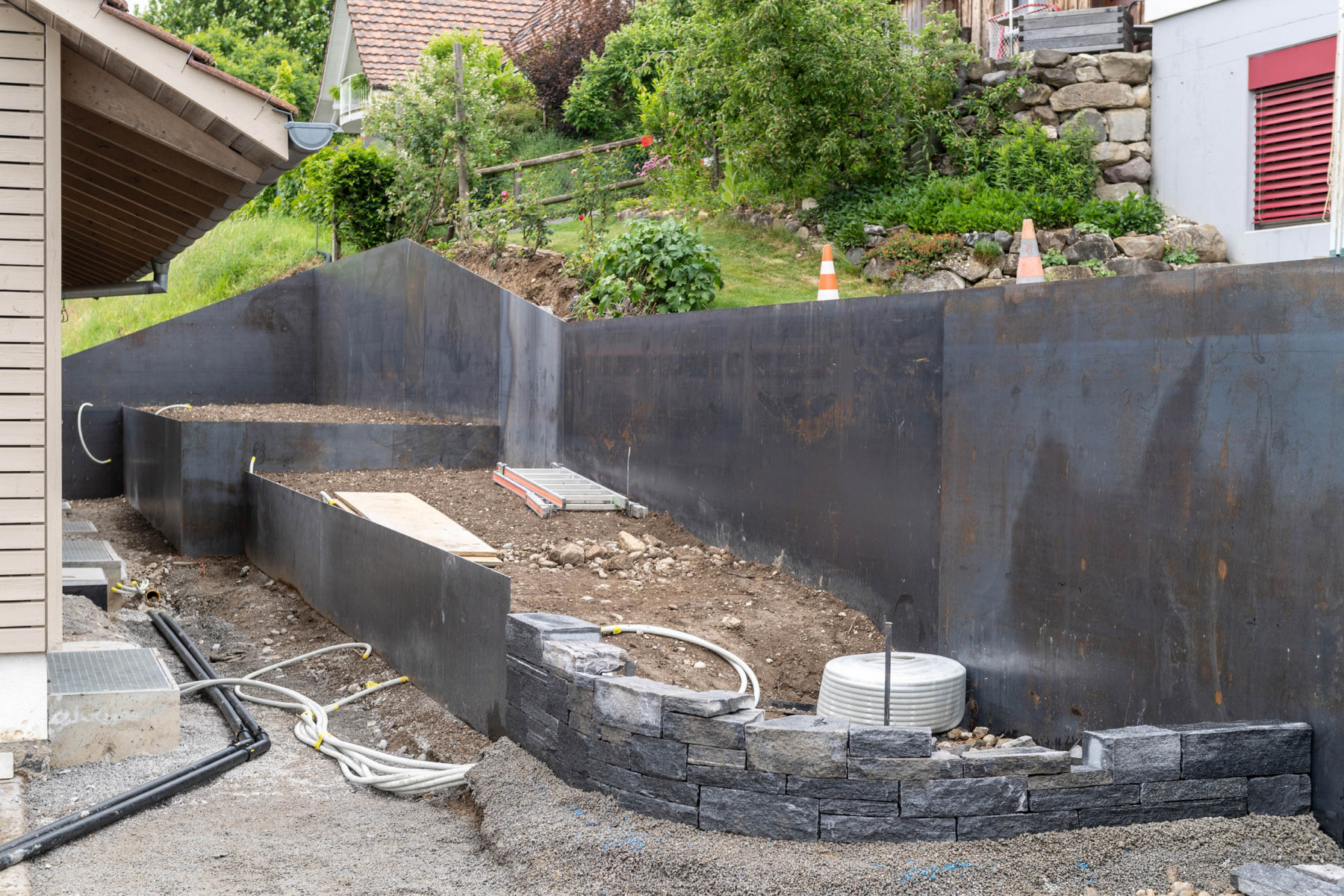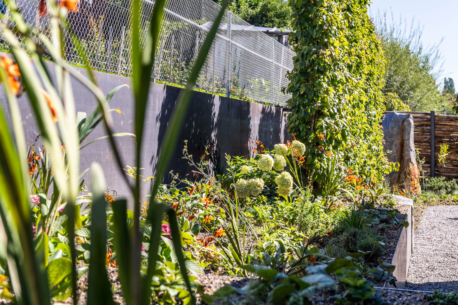 Eine Fertiggarage, an der westlichen Hausecke platziert, bietet Platz für das Bike-Hobby und obenauf entsteht ein grosszügiger Loungebereich mit toller Fernsicht. Der Hauszugang wird neu nach unten verlegt und dadurch kann die obere Ebene zu einem gemütliche Wohngarten mit Brunnen und Grillbereich gestaltet werden. Die steile Böschung an der Rückseite wird durch rohen Stahl in neue Ebenen unterteilt und pflegeleicht bepflanzt. Unterschiedliche Sichtschutzelemente sorgen für ein angenehmes Raumgefühl und verhelfen dem Garten zu wohliger Geborgenheit.