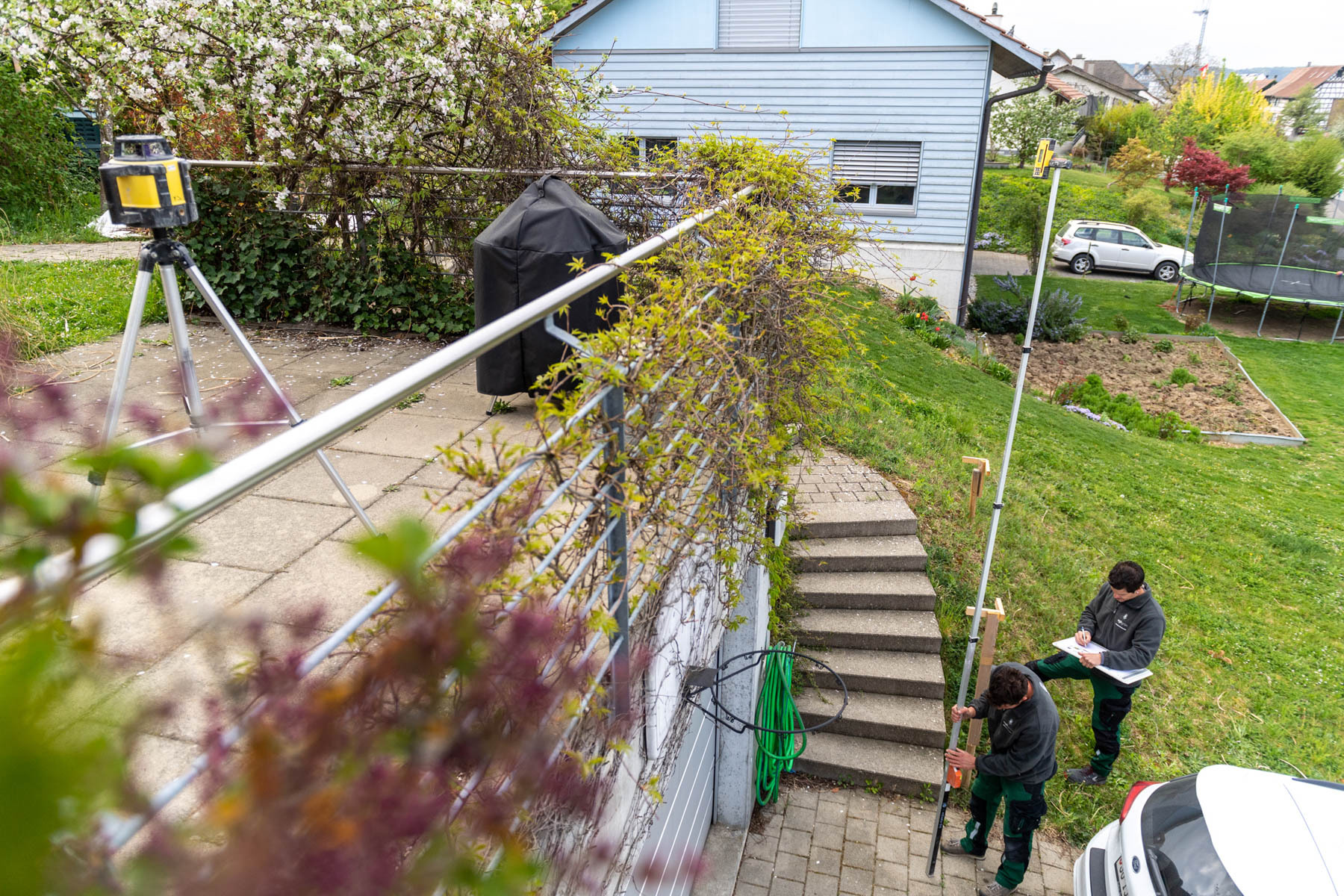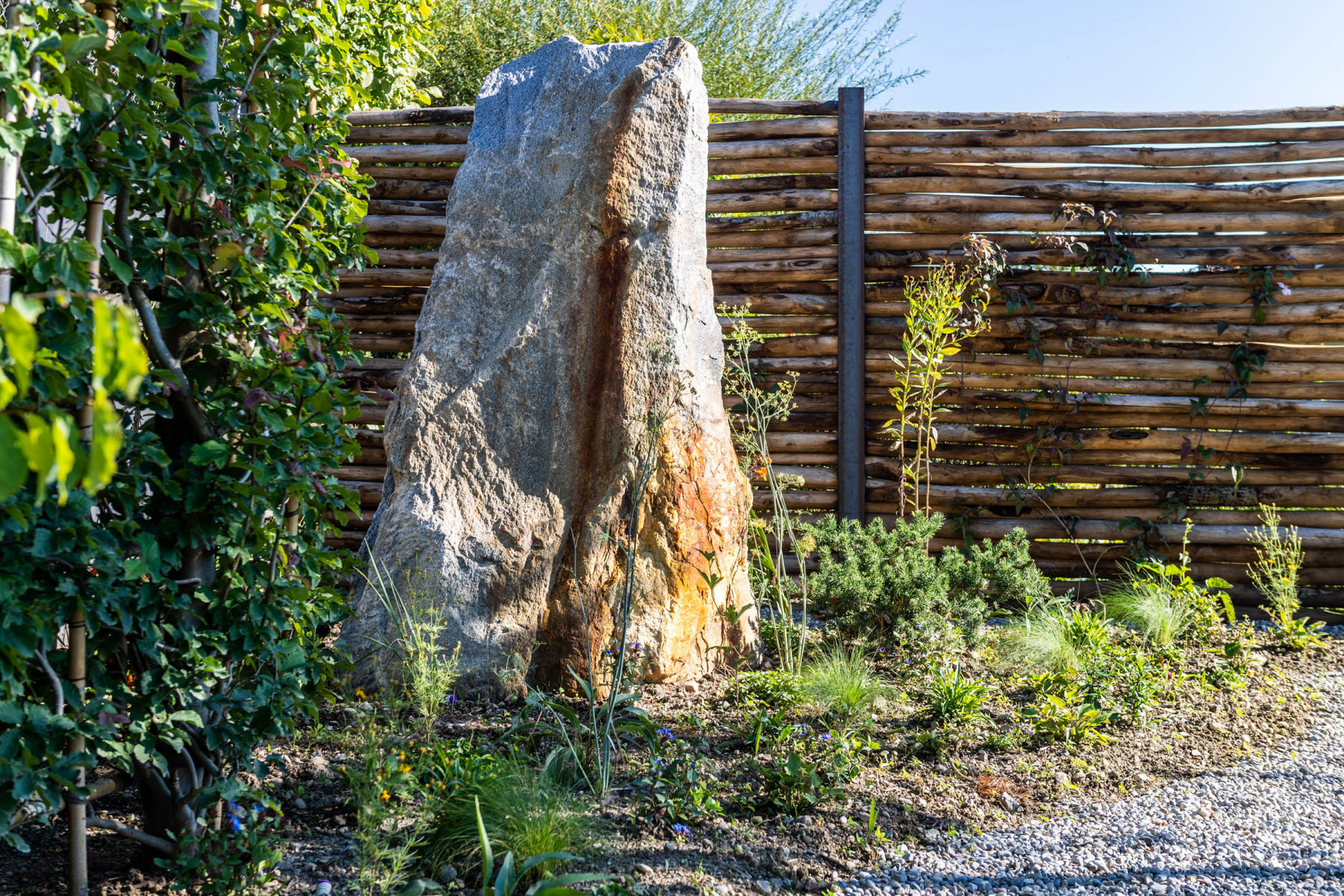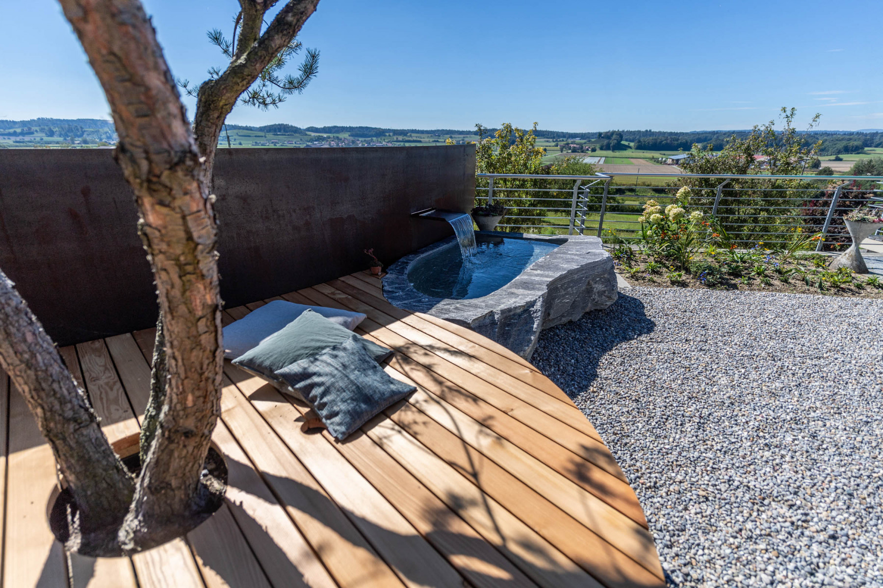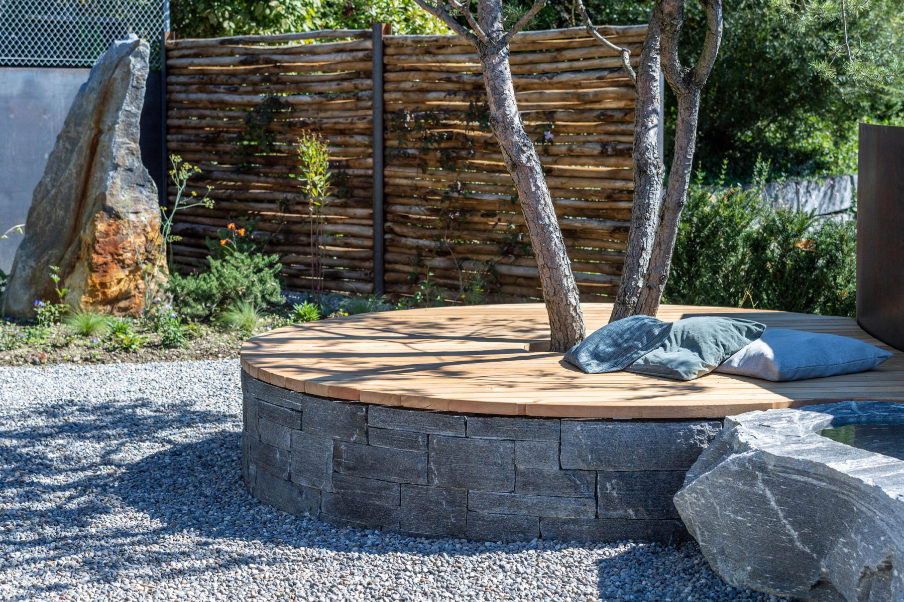 Eine Fertiggarage, an der westlichen Hausecke platziert, bietet Platz für das Bike-Hobby und obenauf entsteht ein grosszügiger Loungebereich mit toller Fernsicht. Der Hauszugang wird neu nach unten verlegt und dadurch kann die obere Ebene zu einem gemütliche Wohngarten mit Brunnen und Grillbereich gestaltet werden. Die steile Böschung an der Rückseite wird durch rohen Stahl in neue Ebenen unterteilt und pflegeleicht bepflanzt. Unterschiedliche Sichtschutzelemente sorgen für ein angenehmes Raumgefühl und verhelfen dem Garten zu wohliger Geborgenheit.