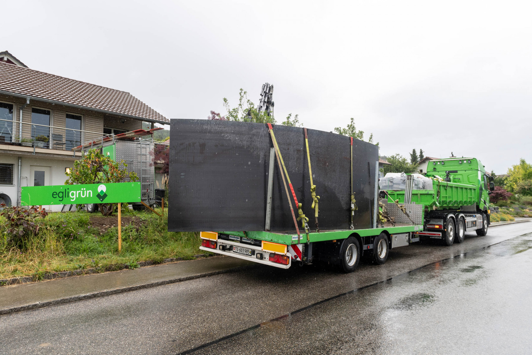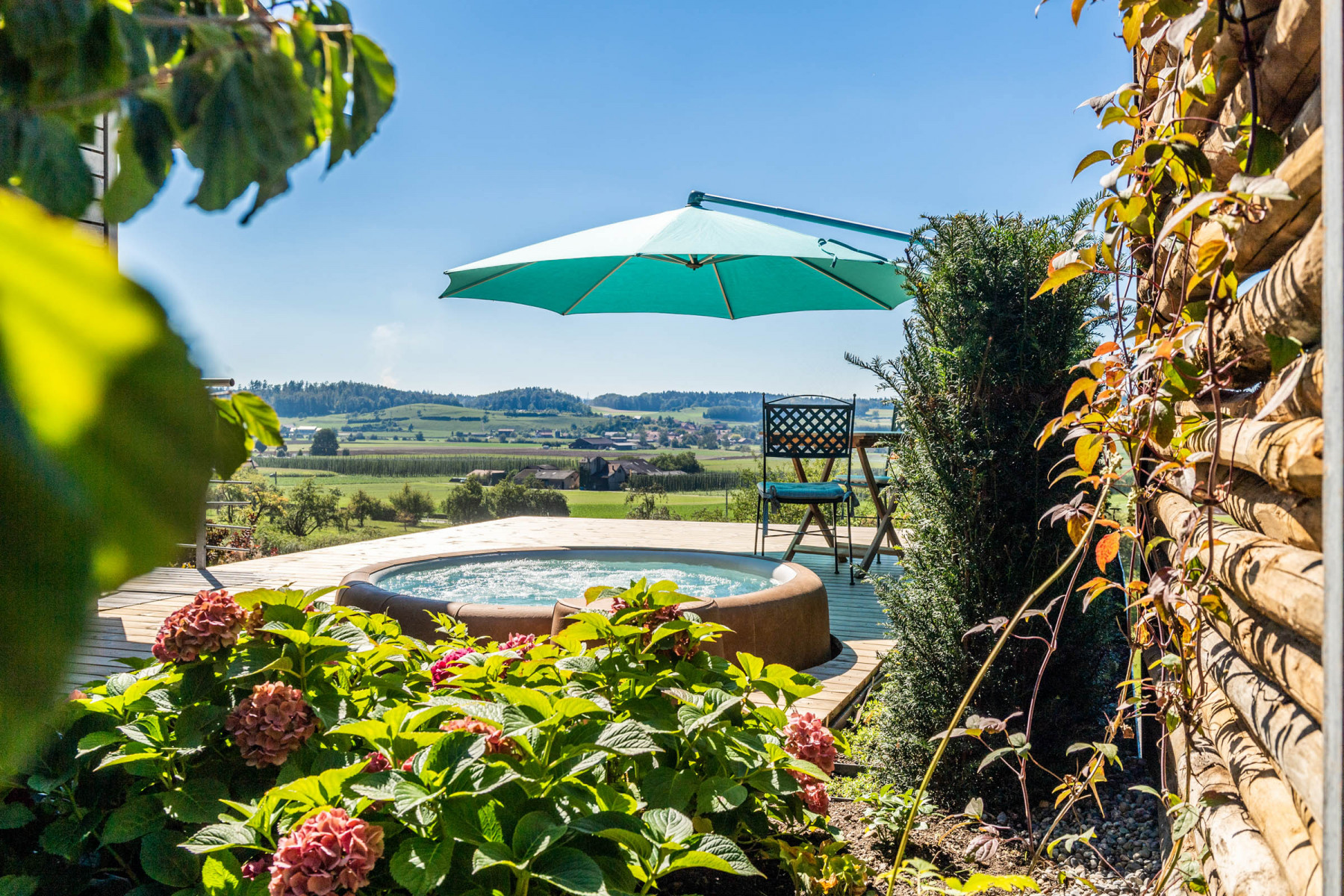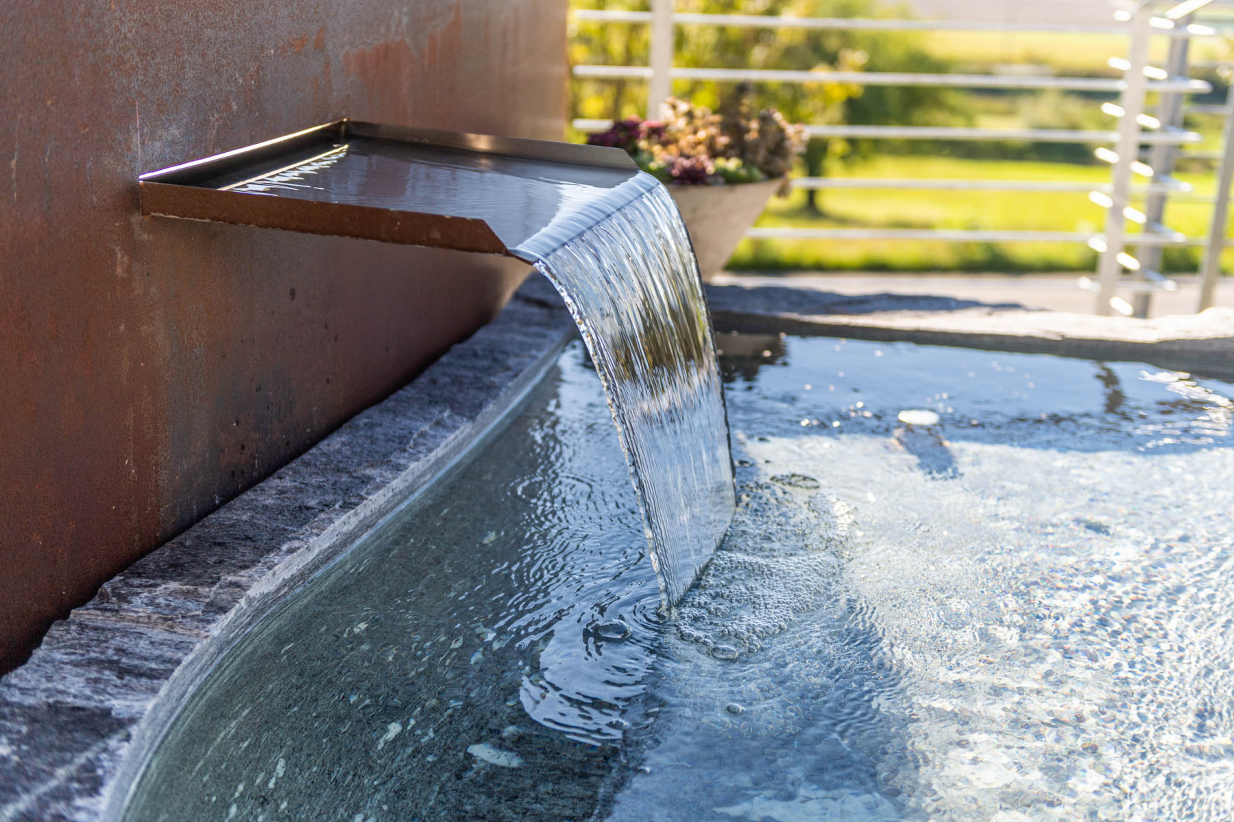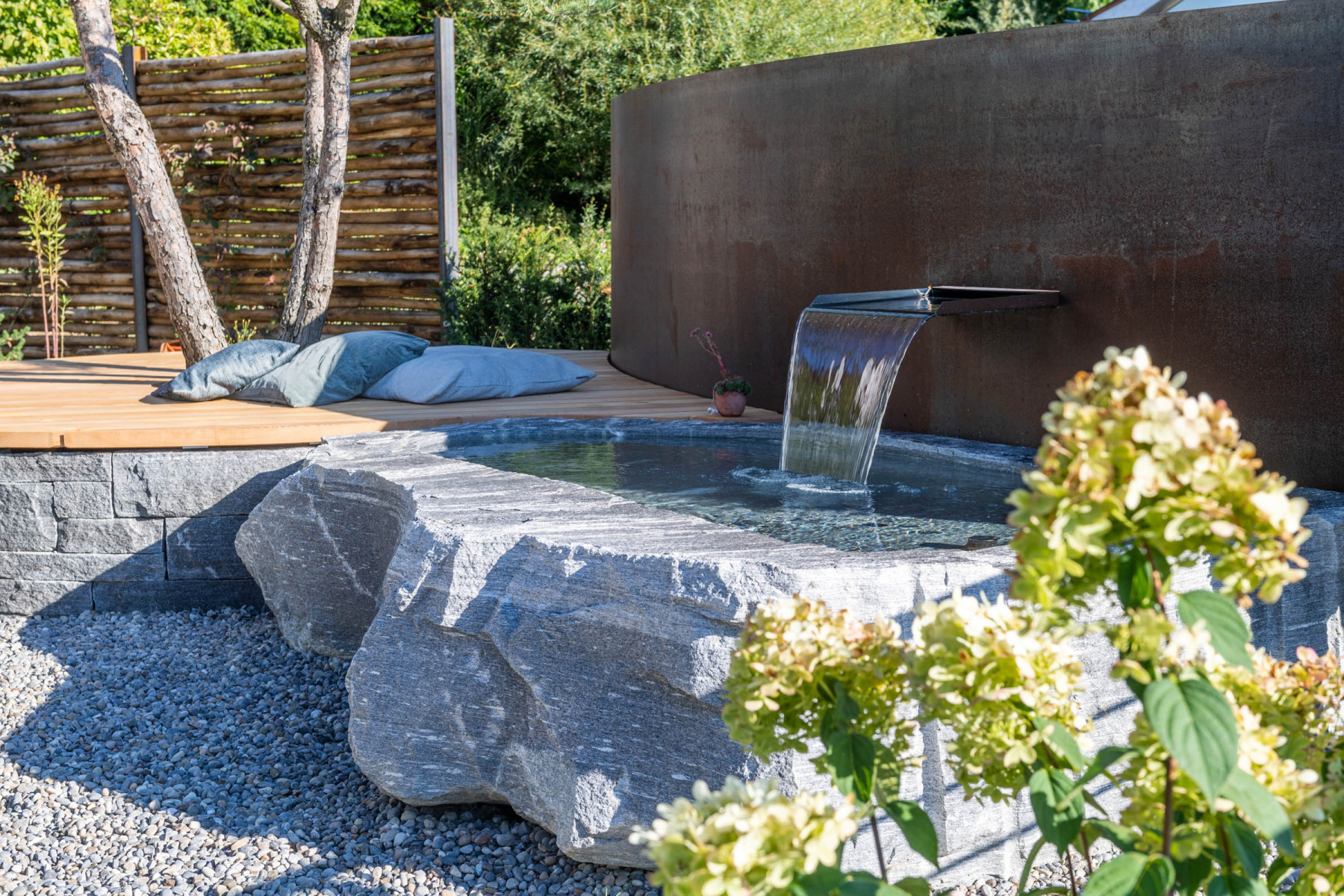Eine Fertiggarage, an der westlichen Hausecke platziert, bietet Platz für das Bike-Hobby und obenauf entsteht ein grosszügiger Loungebereich mit toller Fernsicht. Der Hauszugang wird neu nach unten verlegt und dadurch kann die obere Ebene zu einem gemütliche Wohngarten mit Brunnen und Grillbereich gestaltet werden. Die steile Böschung an der Rückseite wird durch rohen Stahl in neue Ebenen unterteilt und pflegeleicht bepflanzt. Unterschiedliche Sichtschutzelemente sorgen für ein angenehmes Raumgefühl und verhelfen dem Garten zu wohliger Geborgenheit.