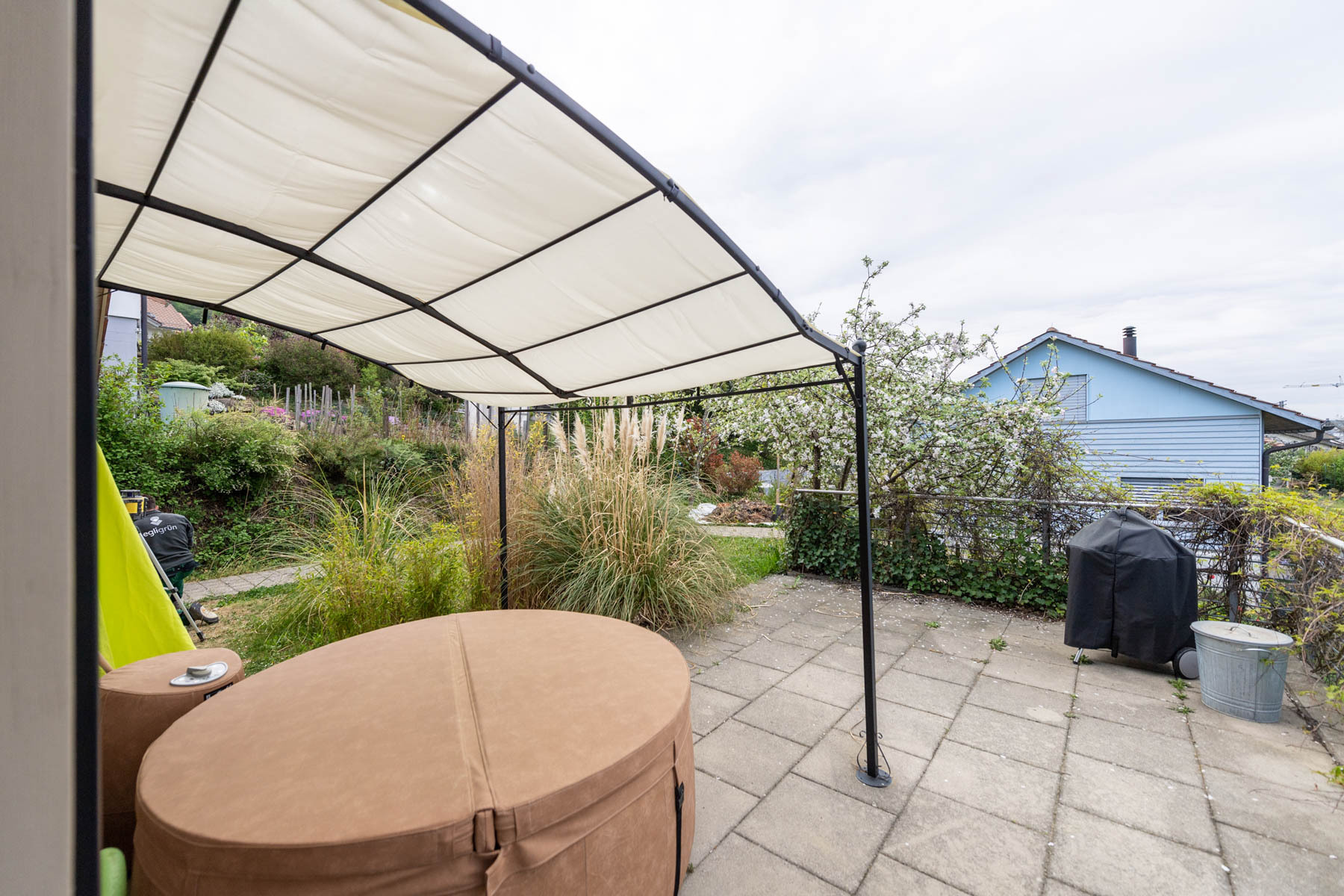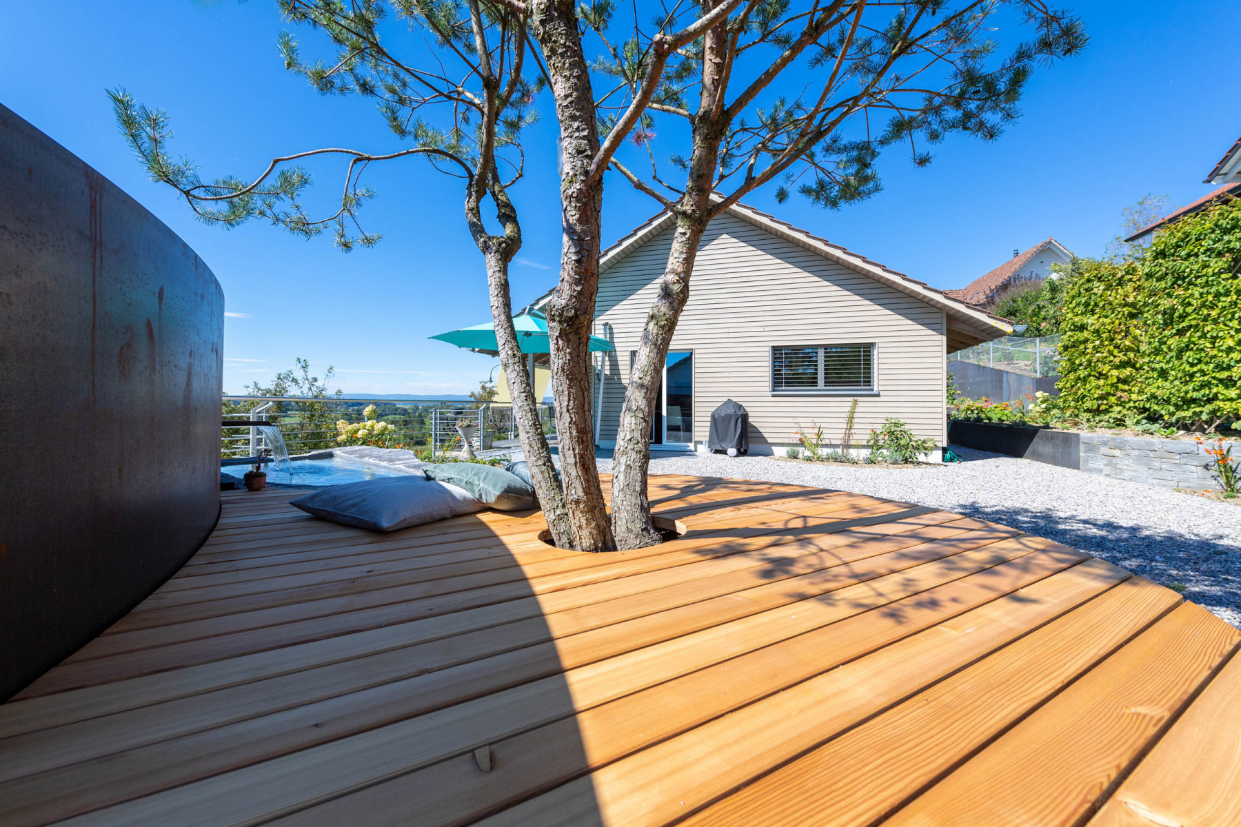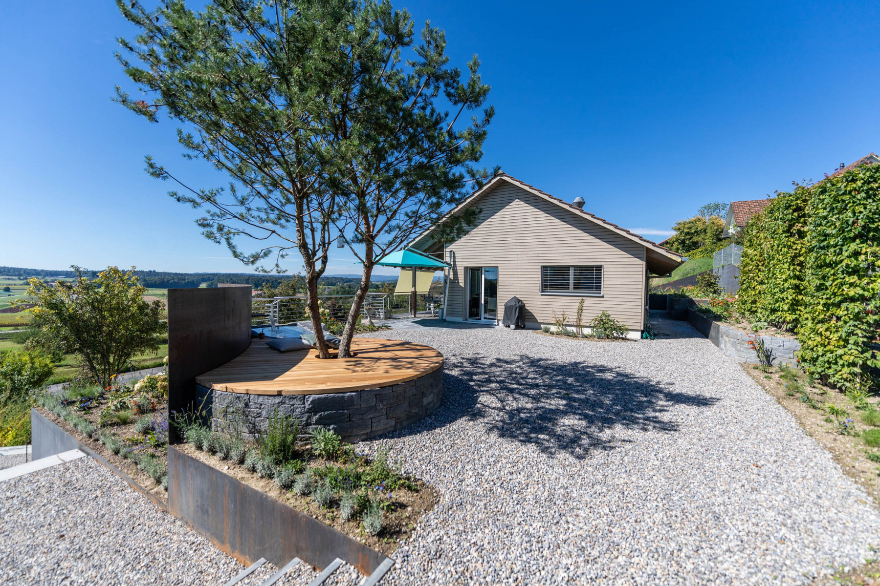 Es ist soweit und die Bauarbeiten sind beendet. Die Garage wurde angebaut und darauf ist ein neuer Relaxbereich mit toller Aussicht entstanden. Ehemalige Böschungen und Zugang sind nun bequem zu bewirtschaften und der Garten hat ein neues Raumgefühl erhalten. Die Bauherrschaft freut sich über den Platzgewinn und die gemütliche Atmosphäre, welche mit dem Wachstum der Pflanzen noch intensiver wird.