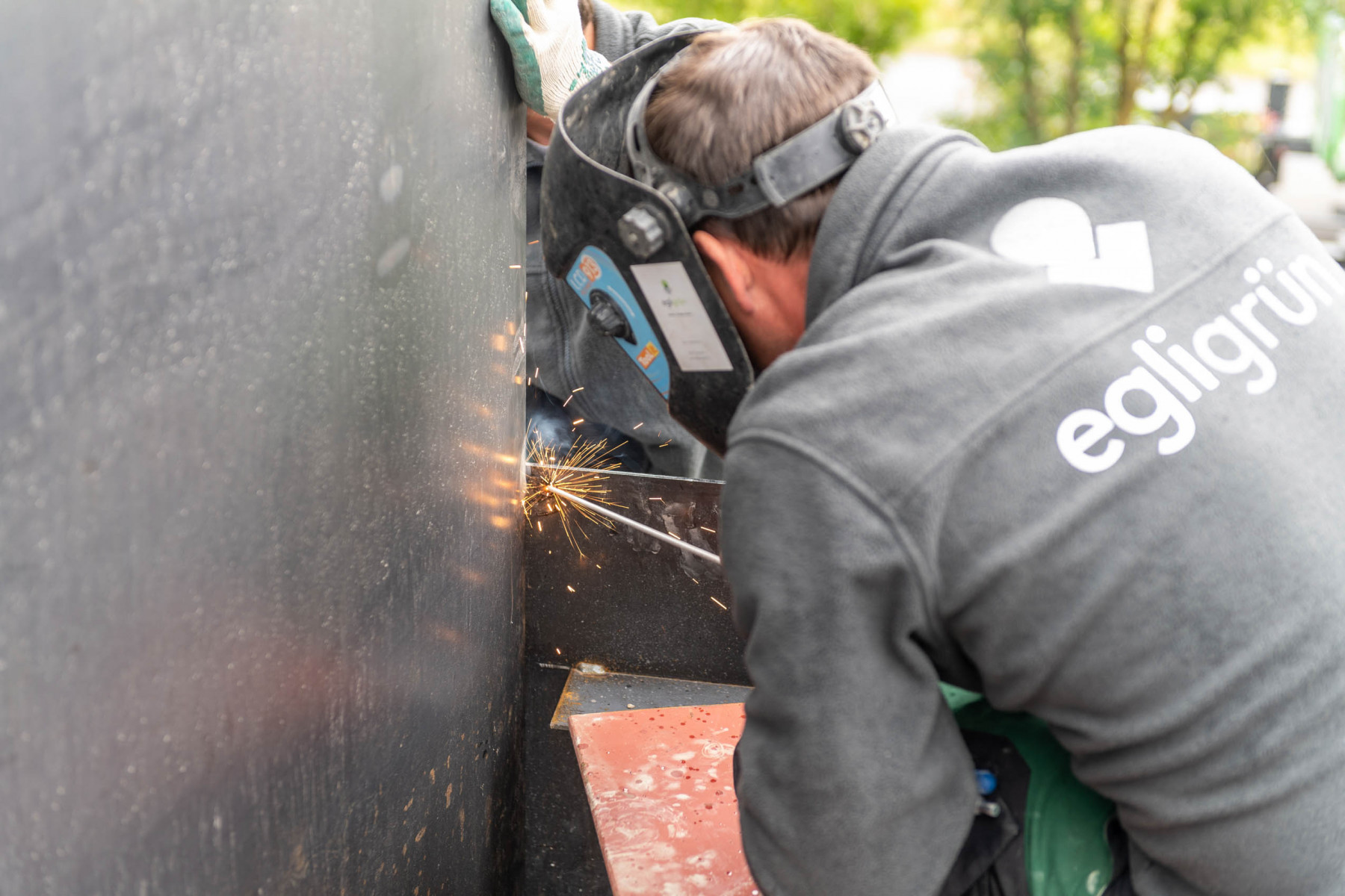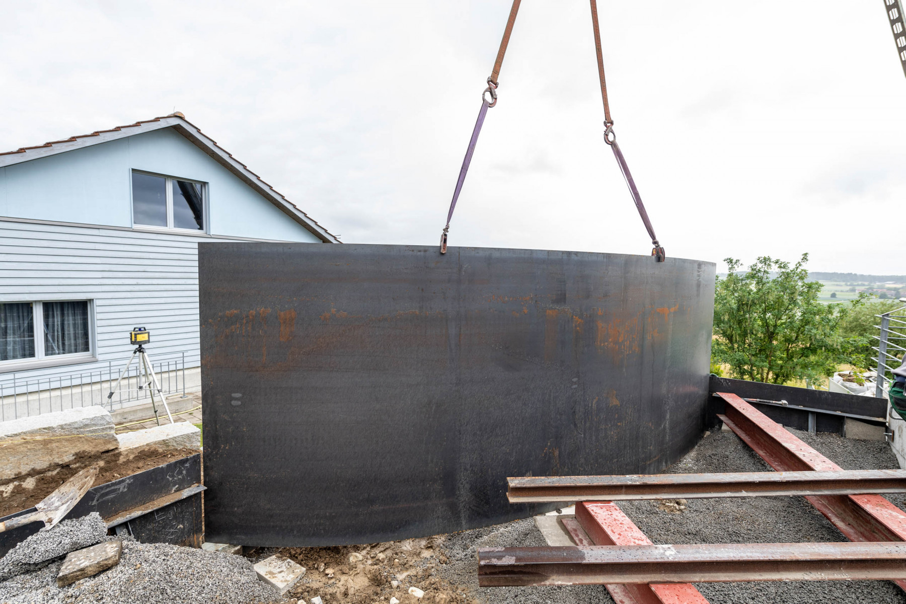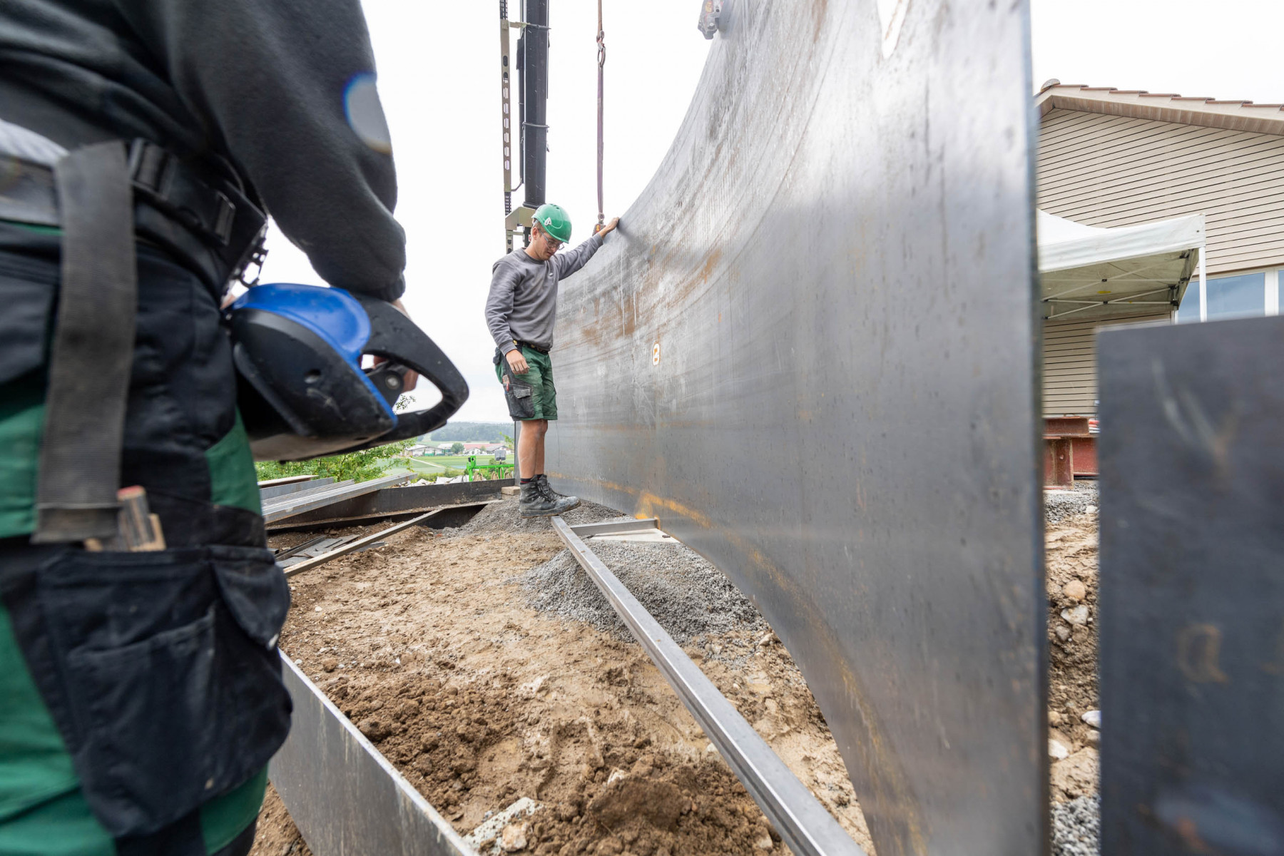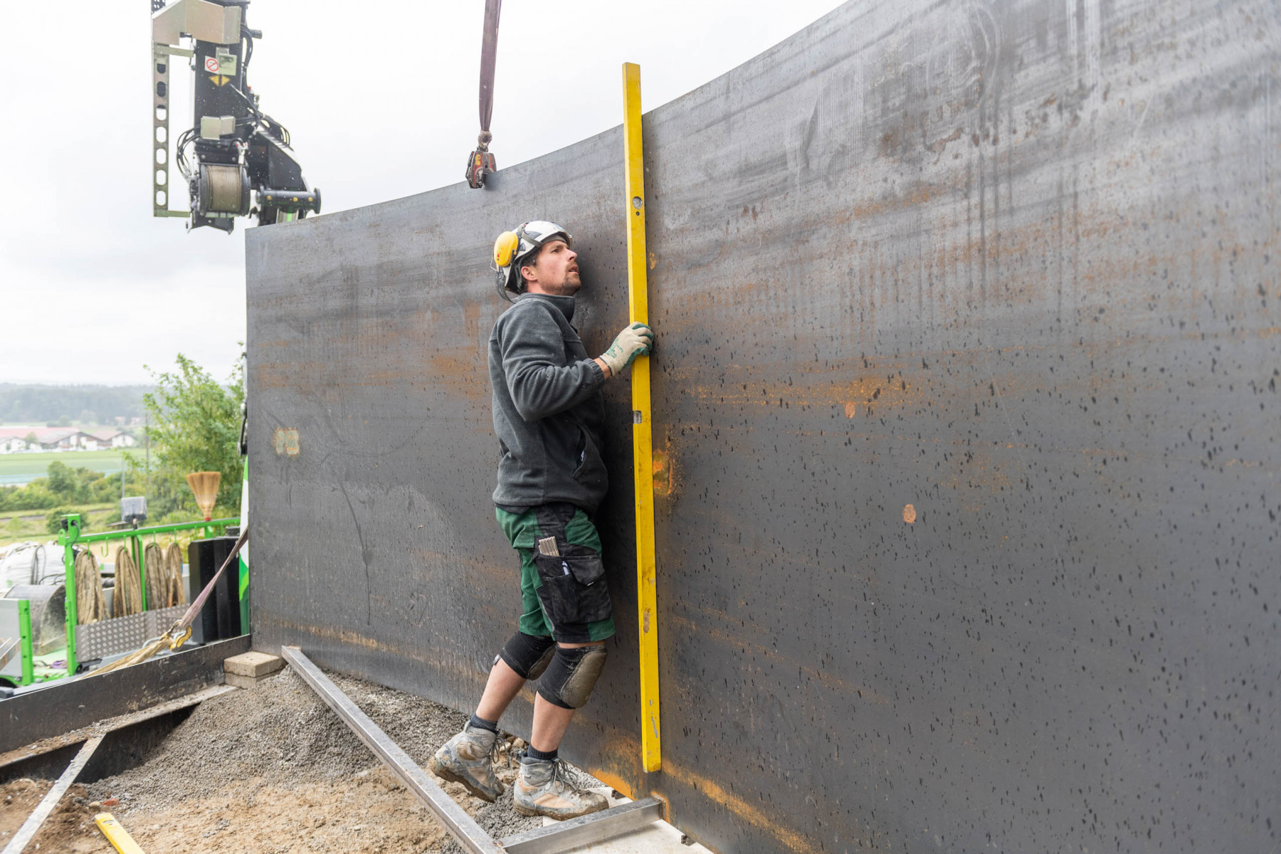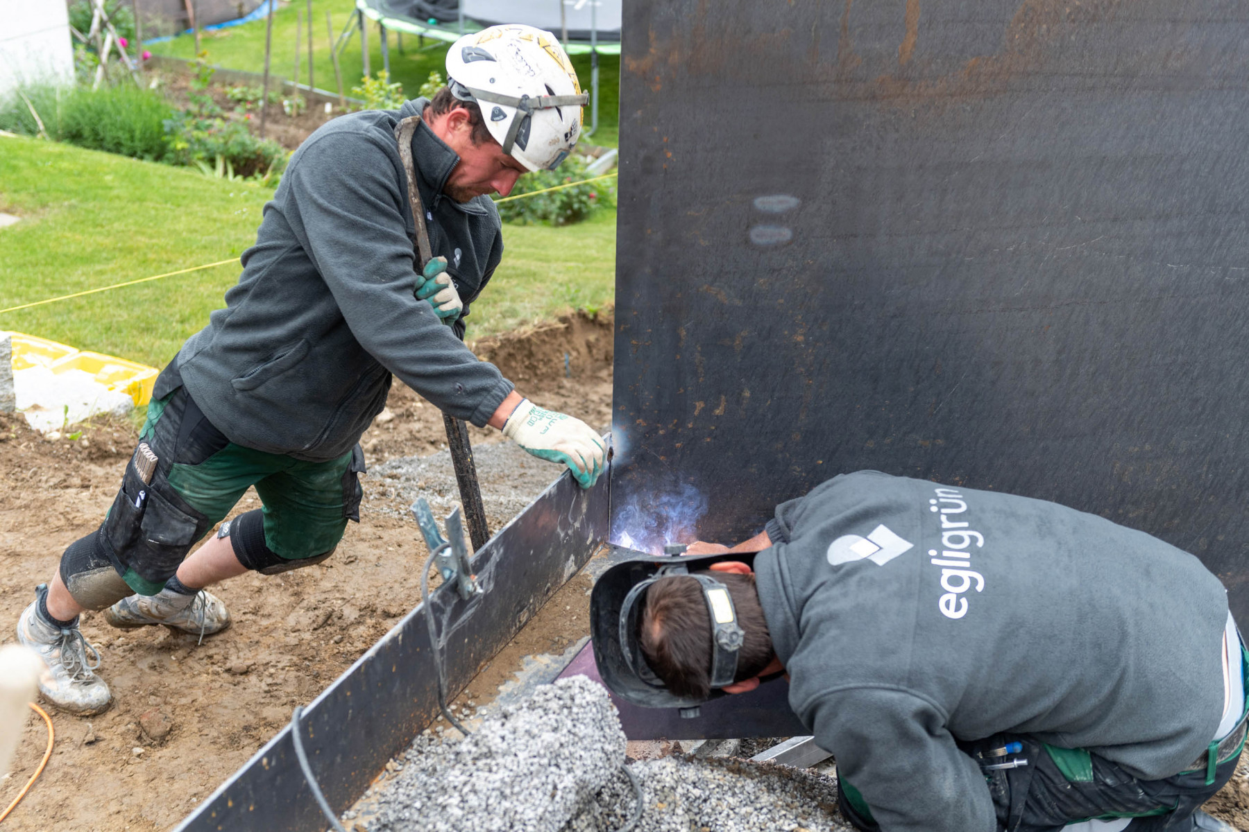Wände aus rohem Stahl dienen zur Höhenüberbrückung, fungieren als Sichtschutz und bilden neue ‚Räume‘.