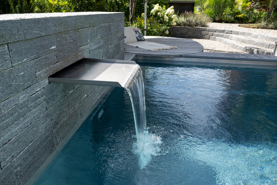 Wie bei allen seinen Projekten setzte Marcel Egli auch hier ausschliesslich Schweizer Materialien ein. «Diese Naturmaterialien haben eine unnachahmliche Ausstrahlung und Kraft.» Die Beläge, Mauern, die Wand mit Cheminée, Theken und der Treppenaufgang sind aus Calanca Gneis. Der für die Theke mit Holzlager und die Randabschlüsse der Staudenflächen gewählte rohe Stahl korrespondiert ausgezeichnet mit dem Lärchenholz der Sitz- und Liegeroste. Der Pool mit Schwalleinlauf ist aus Chromstahl. Der Verbindungsweg wurde mit Beton-Antikverbundsteinen ausgelegt, und überall dazwischen lockern Rundkiesbeläge (gewaschener Kies aus der Region) die Flächen auf. Zusammen mit der Bepflanzung wurde eine warme, natürliche Atmosphäre geschaffen, die individuellen Spielraum für Nutzung, Möblierung und Gestaltung bietet.