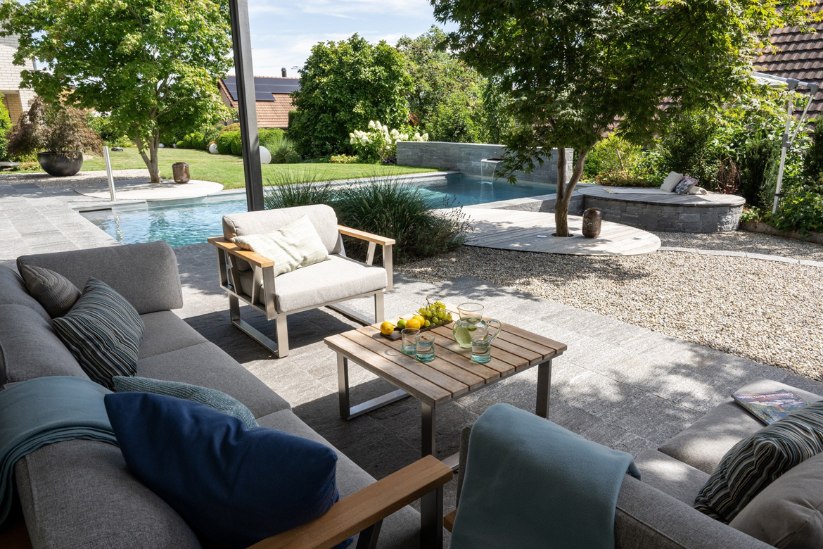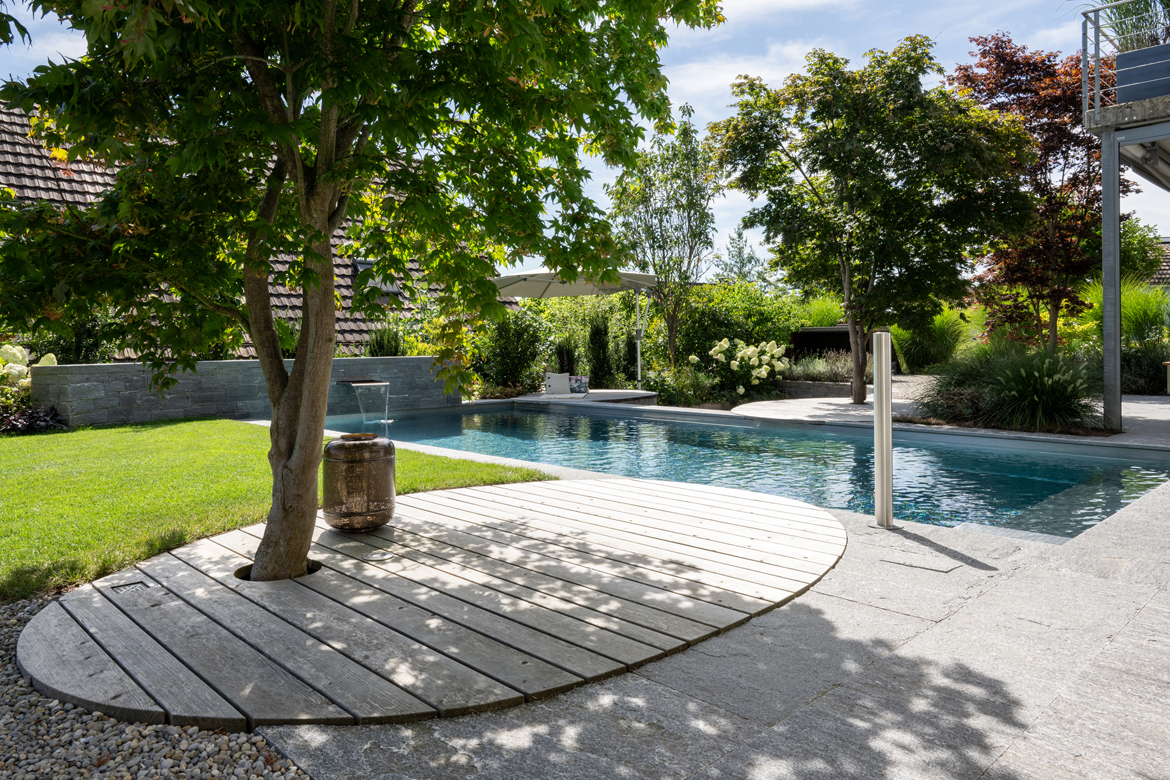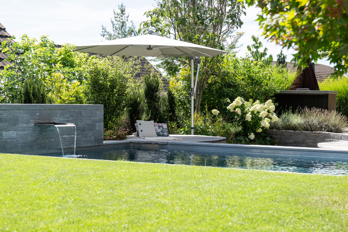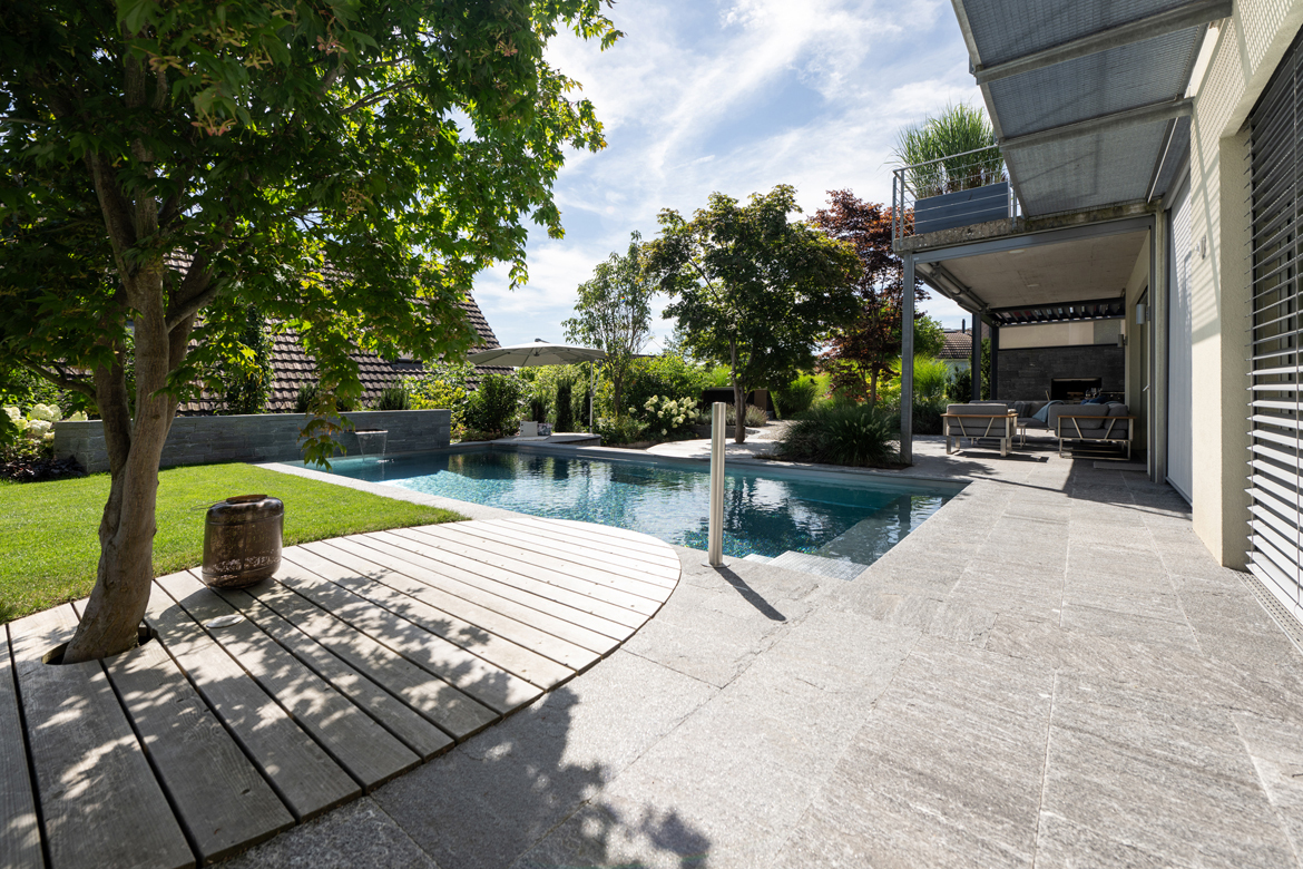 Der Einfamilienhausgarten in einem Wohnquartier am Dorfrand in der Nähe von Winterthur präsentierte sich mit seinen grossen Rasenflächen und akkuraten grauen Steinböden rund ums Haus relativ karg und wenig einladend. An drei Seiten begrenzen Böschungen das Grundstück und vom Garten bis zum Eingangsbereich steigt das Gelände gut um ein ganzes Stockwerk an. Höhenunterschiede, viel ungenutzte Rasenflächen, ein unstrukturiertes Gelände und fehlende Gesamtatmosphäre – so lässt sich die Ausgangslage für dieses Gartenprojekt beschreiben. Doch man hatte Pläne: Hier sollten ein Wohngarten mit Pool und Pavillon sowie ein Hausanbau mit Velo- und Geräteraum endlich den ersehnten Mehrwert schaffen. Ein gedeckter Sitzplatz mit Grill und Feuerstelle standen ebenfalls auf der Wunschliste.