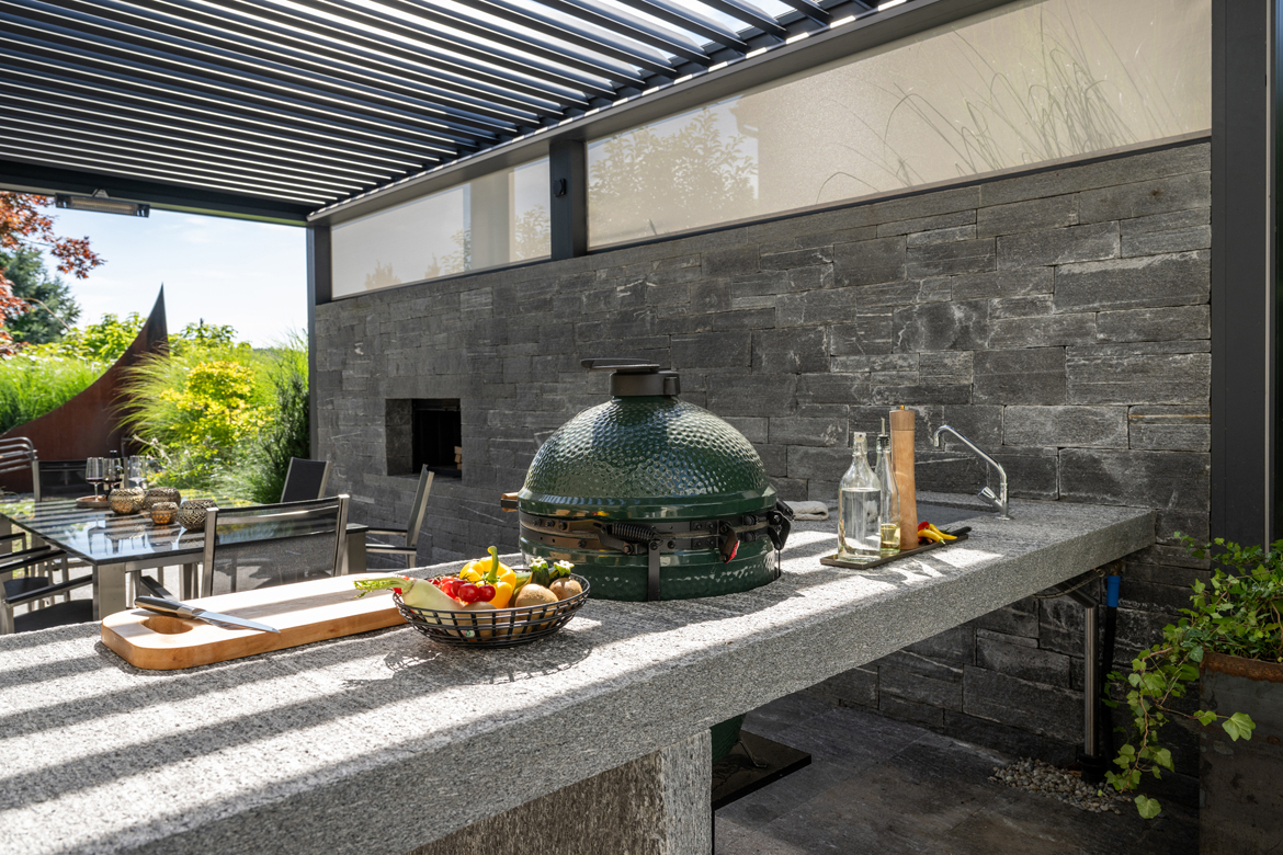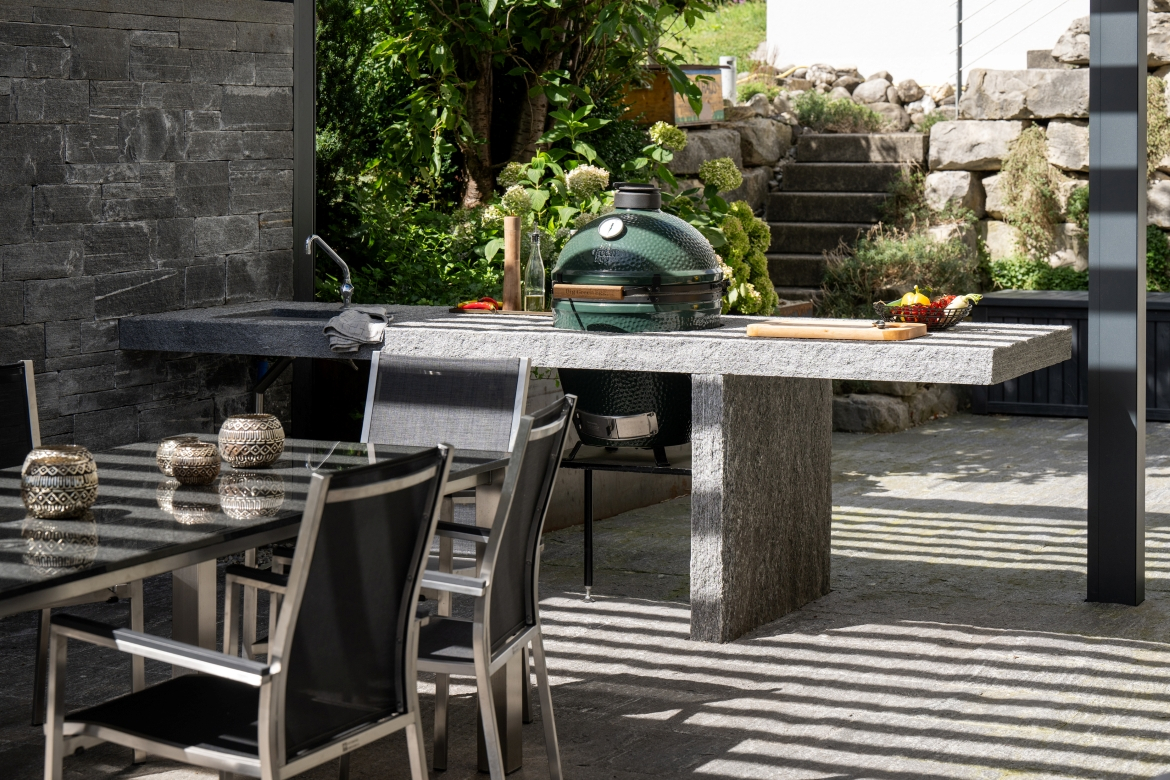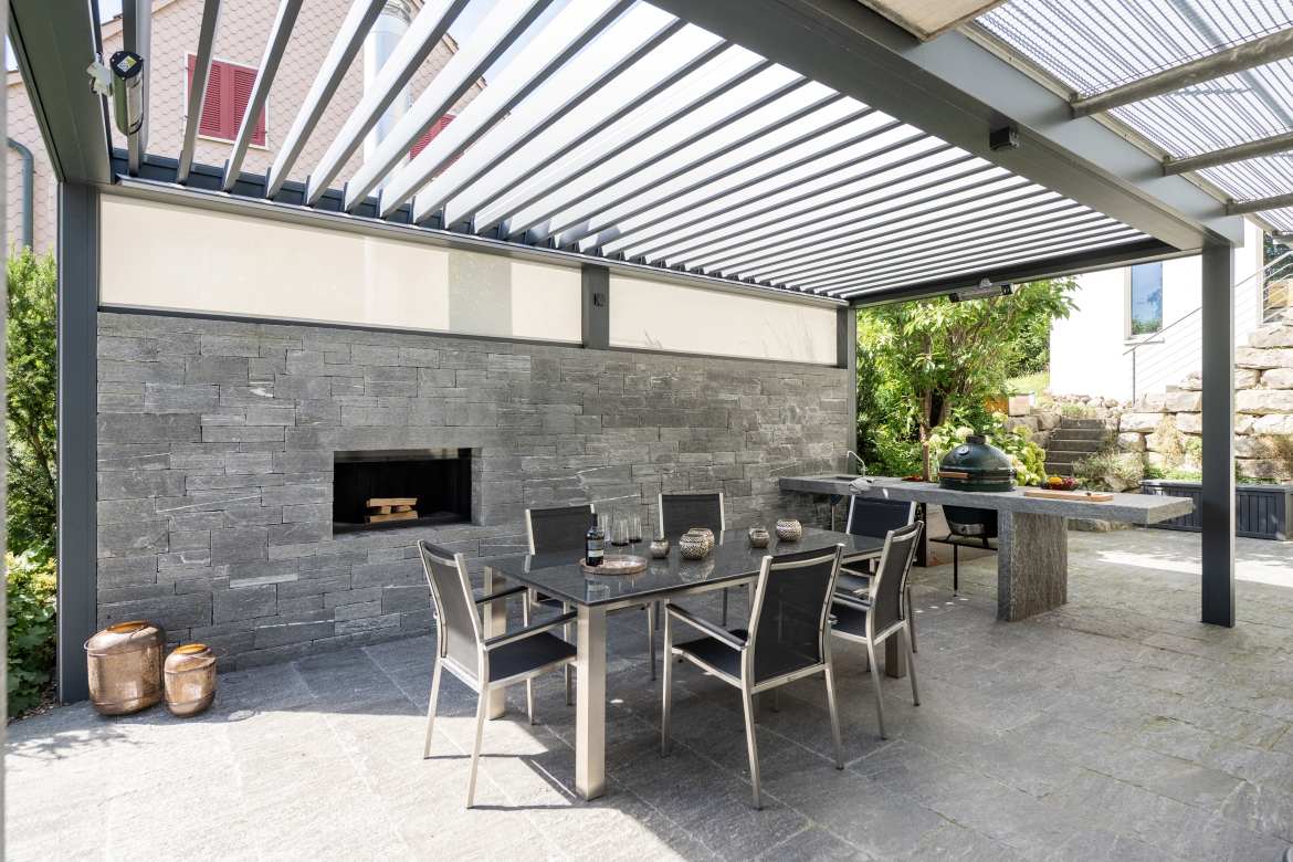 Gartenplaner Marcel Egli hatte freie Hand, dieses neue Gartenreich umzusetzen. Man war offen für kreative Ideen und gespannt auf die Vorschläge und Möglichkeiten. In seiner Gesamtplanung legte Marcel Egli besonderen Wert auf ebenso raffinierte wie praktische Lösungen. Die Anbauten, der Fahrradraum oder besondere Elemente wie das Storendach, die Cheminéewand oder die Aussenküche weisen auf diese sorgfältigen Überlegungen hin. Dabei kam ihm seine eigene reiche Erfahrung und die hohe Kompetenz der für die Anbauten und Baumassnahmen beigezogenen Fachplaner zugute.