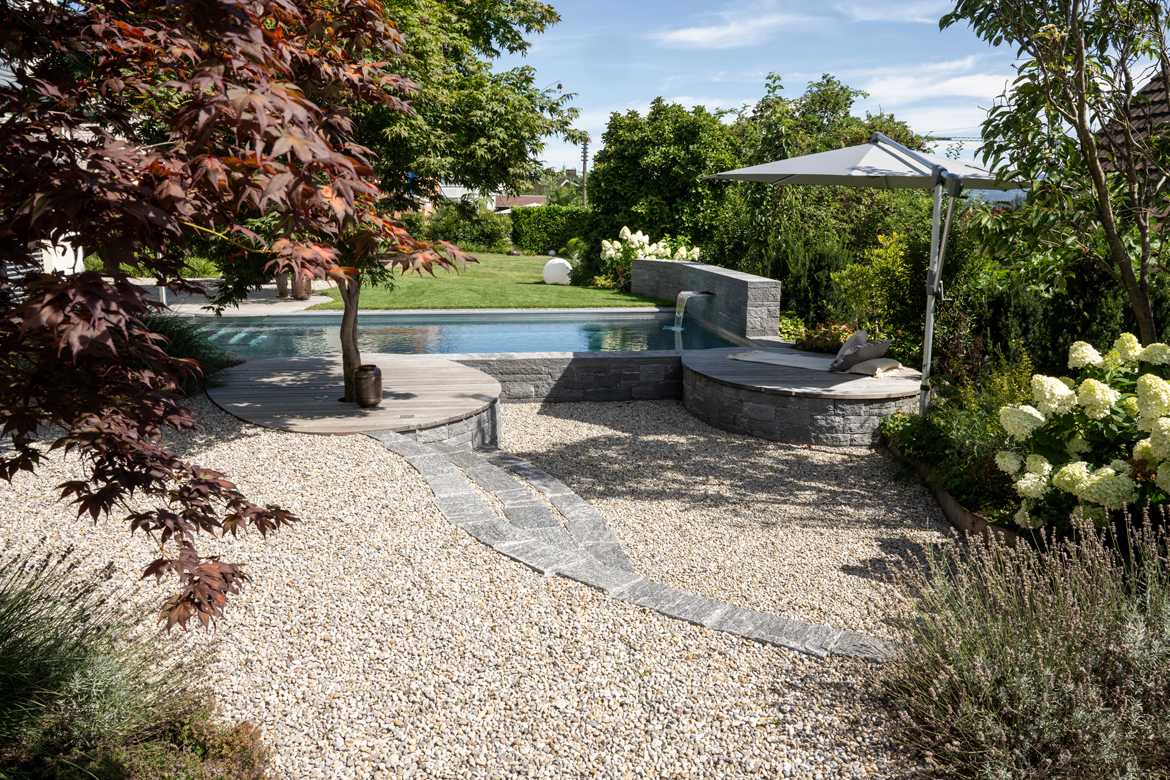 Aus der ungenutzten Rasenfläche ist ein Paradies mit Pool, Liegedeck und terrassierten Wohnflächen geworden.