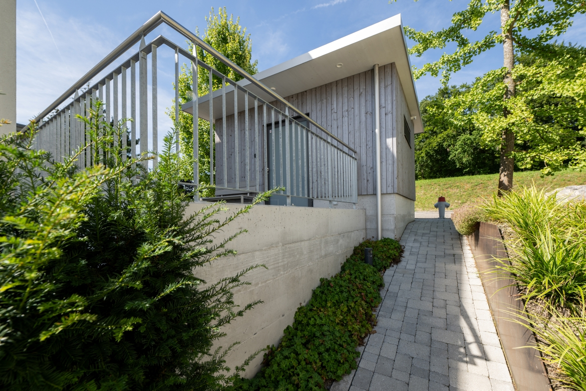 Der Chromstahlpool mit Gegenstromanlage, Rollladenabdeckung und automatischer Wasseraufbereitung ist ein magischer Anziehungspunkt und hat dem Anwesen einen entscheidenden Mehrwert verliehen. Er fügt sich harmonisch und gleichwertig in den Garten, lädt zu sportlichem Schwimmen ein – und auf seinen runden Holzdecks zum Ausruhen, Entspannen und Sonne geniessen. Für die Unterbringung von Pool-Technik und -Zubehör wurde das Untergeschoss des Hauses mit einem Anbau erweitert. Auch WC und Umkleide sind hier untergebracht.