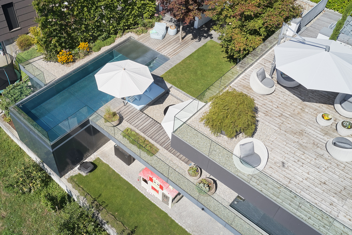 Die Hanglage und die geologischen Gegebenheiten erforderten besondere Massnahmen, Konstruktionen und einen Kunstgriff: Wegen der engen Platzverhältnisse wurde für den Pool ein Unterbau konstruiert und die Stützmauer musste aufgeschnitten werden. Die grosse Erfahrung von Egli Grün ermöglichte diese einzigartige Lösung.