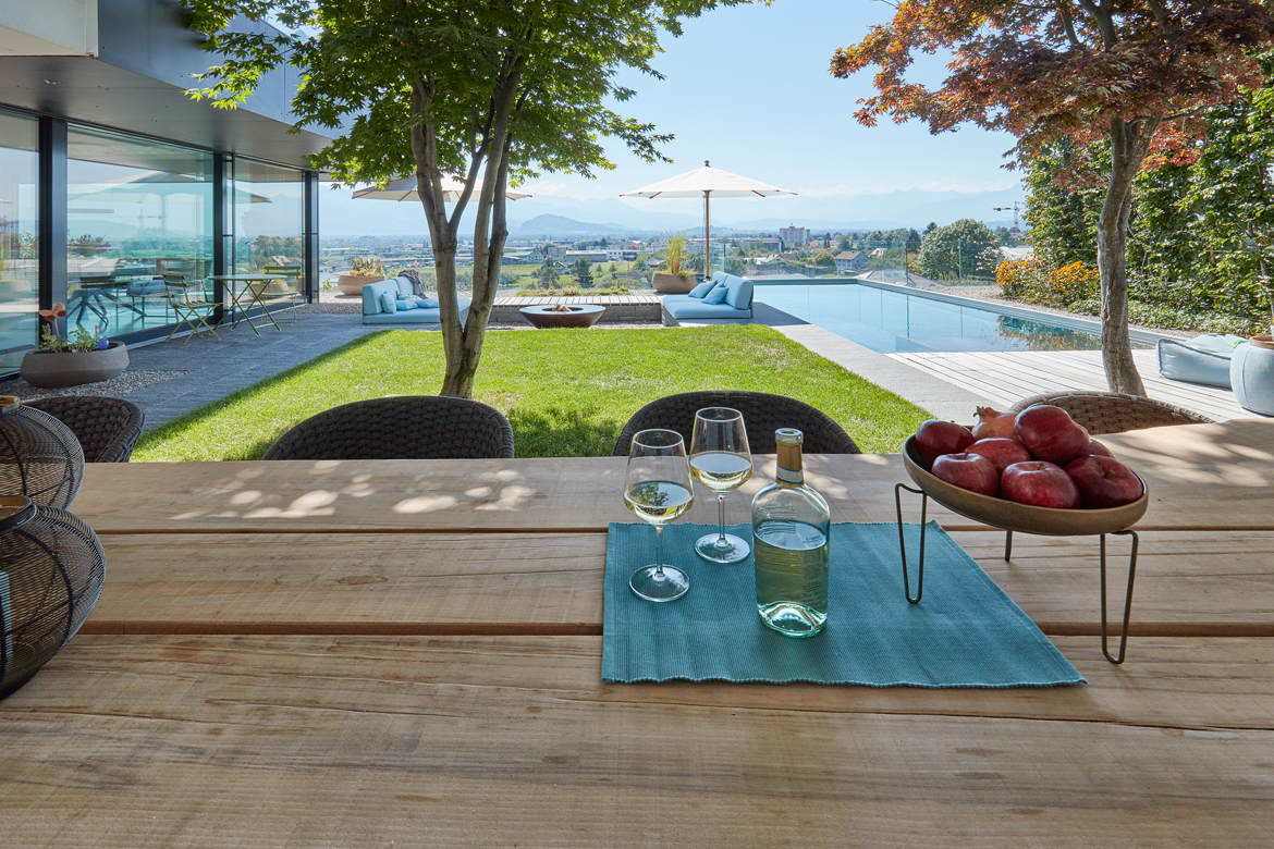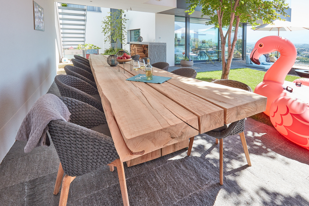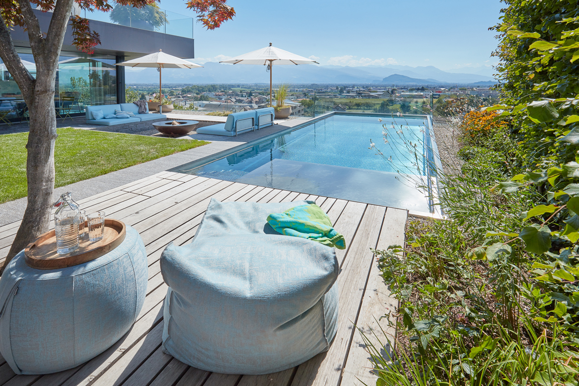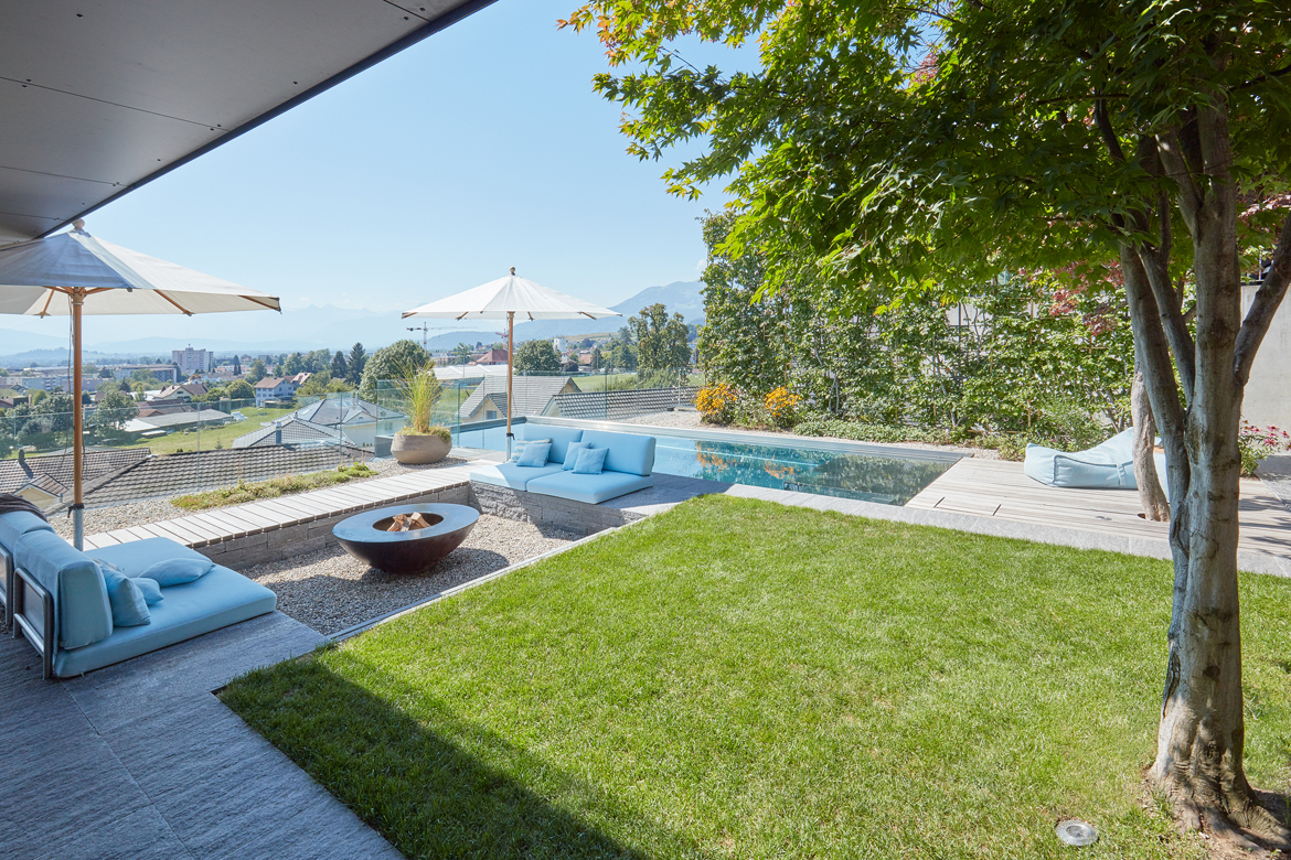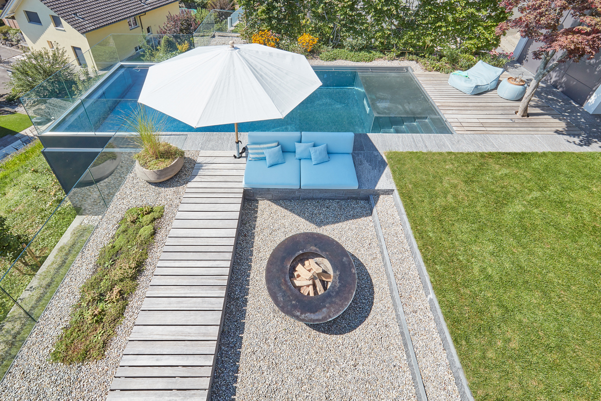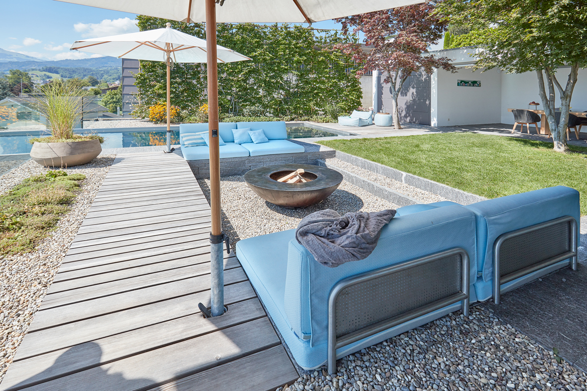 Ein zentraler Wunsch der Familie war, trotz der Hanglage, ein grosser Pool, der möglichst lange im Jahr allen etwas bieten sollte: ein multifunktionales Badevergnügen, für die Kinder zum Spielen und Planschen, für die Erwachsenen zum sportlichen Schwimmen und Relaxen. Die Terrasse sollte offen und einladend sein für Geselligkeit und Gäste, mit offenem Feuer und Grill und mit schattenspendenden Plätzen an heissen Sommertagen. Marcel Egli hatte für die Entwicklung eines Gesamtkonzeptes freie Hand und skizzierte ein Projekt, das genau die Erwartungen erfüllte und in enger Zusammenarbeit mit der Bauherrschaft realisiert werden konnte.