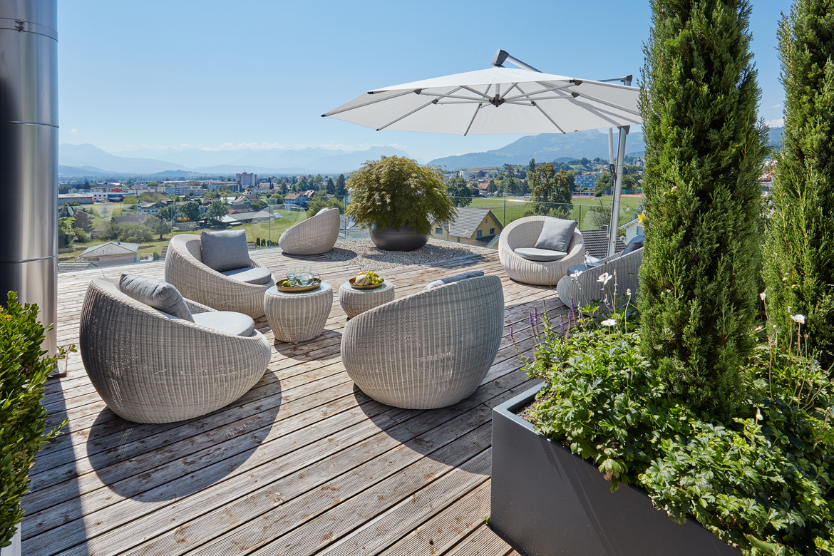 Nicht nur die Materialwahl verbindet die verschiedenen Ebenen von Garten und Terrasse. Eine Metalltreppe wurde zum neuen, direkten Zugang und erschliesst die Terrasse vom Garten aus. Ein neues Holzdeck aus Lärche wurde erstellt, Sonnenschirme direkt in das Holzdeck integriert und mit Rundkiesflächen und Pflanzgefässen aufgelockert. Auch hier tragen Pflanztröge mit Gehölzen und Stauden zur Klimaverbesserung und Raumbildung bei.