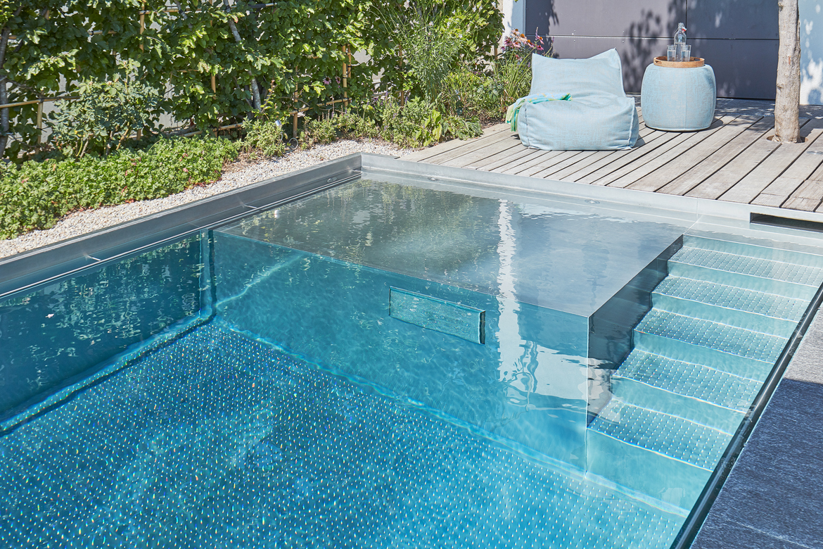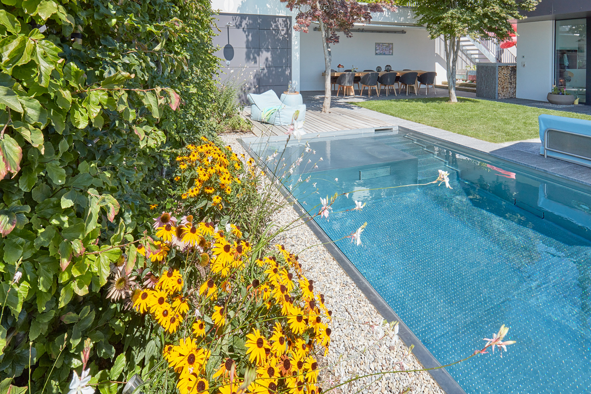 Zweifelsohne ist der Chromstahlpool das Highlight dieses Projektes. Ein Flachwasser Podest dient als entspannende Liegefläche, die Gegenstromanlage ruft zu Sportlichkeit auf, und mit der Rollladenabdeckung und Beheizbarkeit des Wassers (Luftwärmepumpe) ist weit über die Sommermonate hinaus für Badevergnügen gesorgt. Die gesamte Technik mit automatischer Wasseraufbereitung sowie Stauraum
