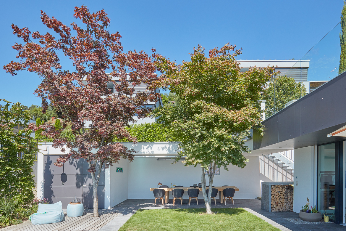 Die Bepflanzung trägt zu mehr Privatsphäre und zur Verbesserung des Mikroklimas bei. Parrotien-Spaliere dienen als Sichtschutz, während Ahornbäume für Schatten sorgen und die Raumbildung unterstützen. Ein Feigenbaum, verschiedene Stauden und Gräser sowie sorgfältig ausgewählte Terrakottagefässe verleihen dem Garten und der Terrasse Farbe und Leben.