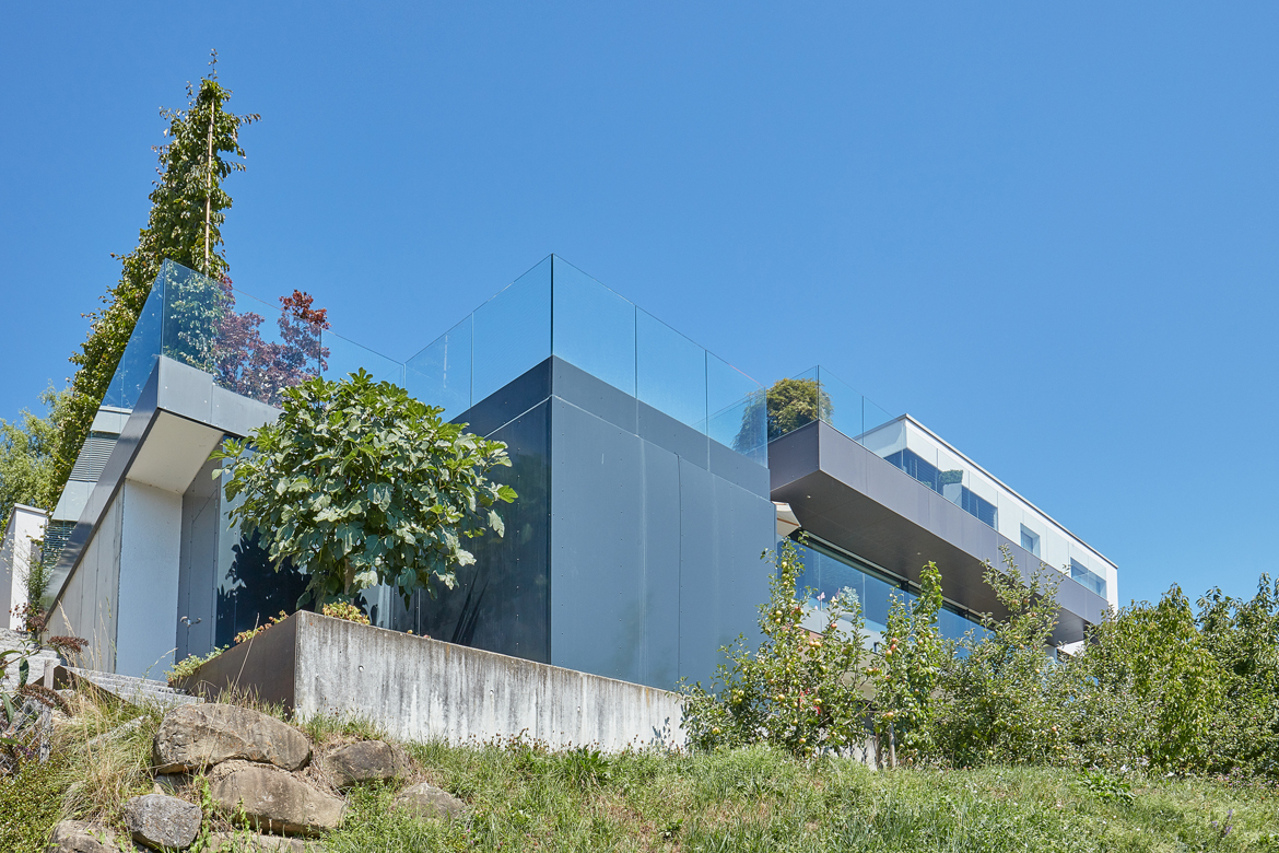 Über drei Etagen erstreckt sich das in einem dicht besiedelten Wohnquartier am Dorfrand erstellte Terrassenhaus. Die starke Hanglage und der Stil der Nachbargebäude hatten die Architektur zu einem grossen Teil mitbestimmt. Der Gestaltung des Aussenraums wurde anfangs keine besondere Beachtung geschenkt: Rasenflächen und einige Sträucher, Betonplatten auf den Böden und Streifen mit Rundkies, auf denen sich einzelne Töpfe verteilten, beherrschten das Bild des Gartens; das Holzdeck der Terrasse wies schon nach kurzer Zeit Spuren der Witterung auf.