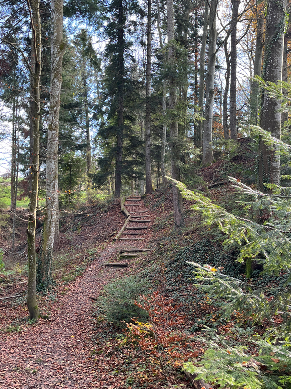 Der Weg führt über viele Naturstrassen, zum Teil recht ansteigend oder mit Treppenstufen. Es gibt für diese zwei Passagen auch Alternativstrecken (auf Streckenplan pink markiert) mit problemlos begehbaren Kieswegen.