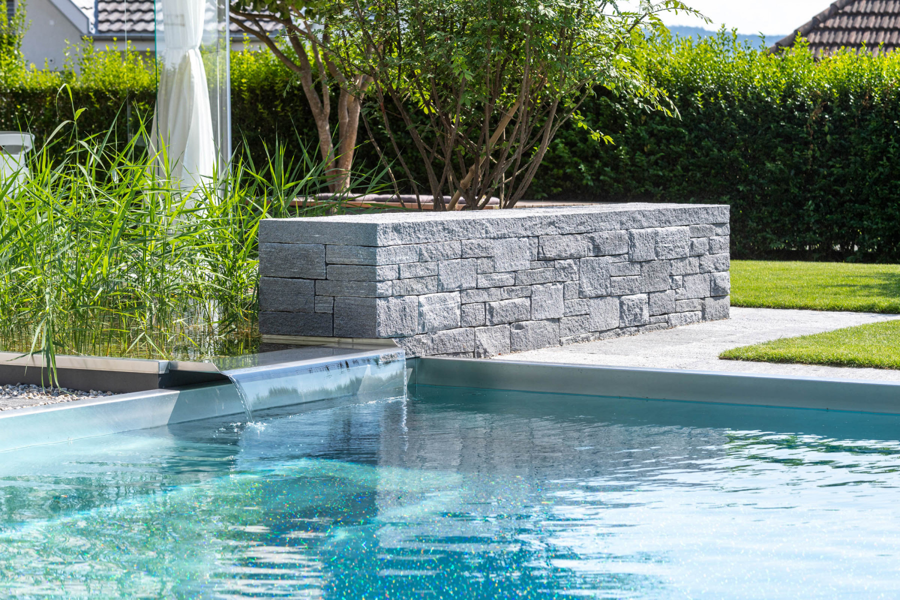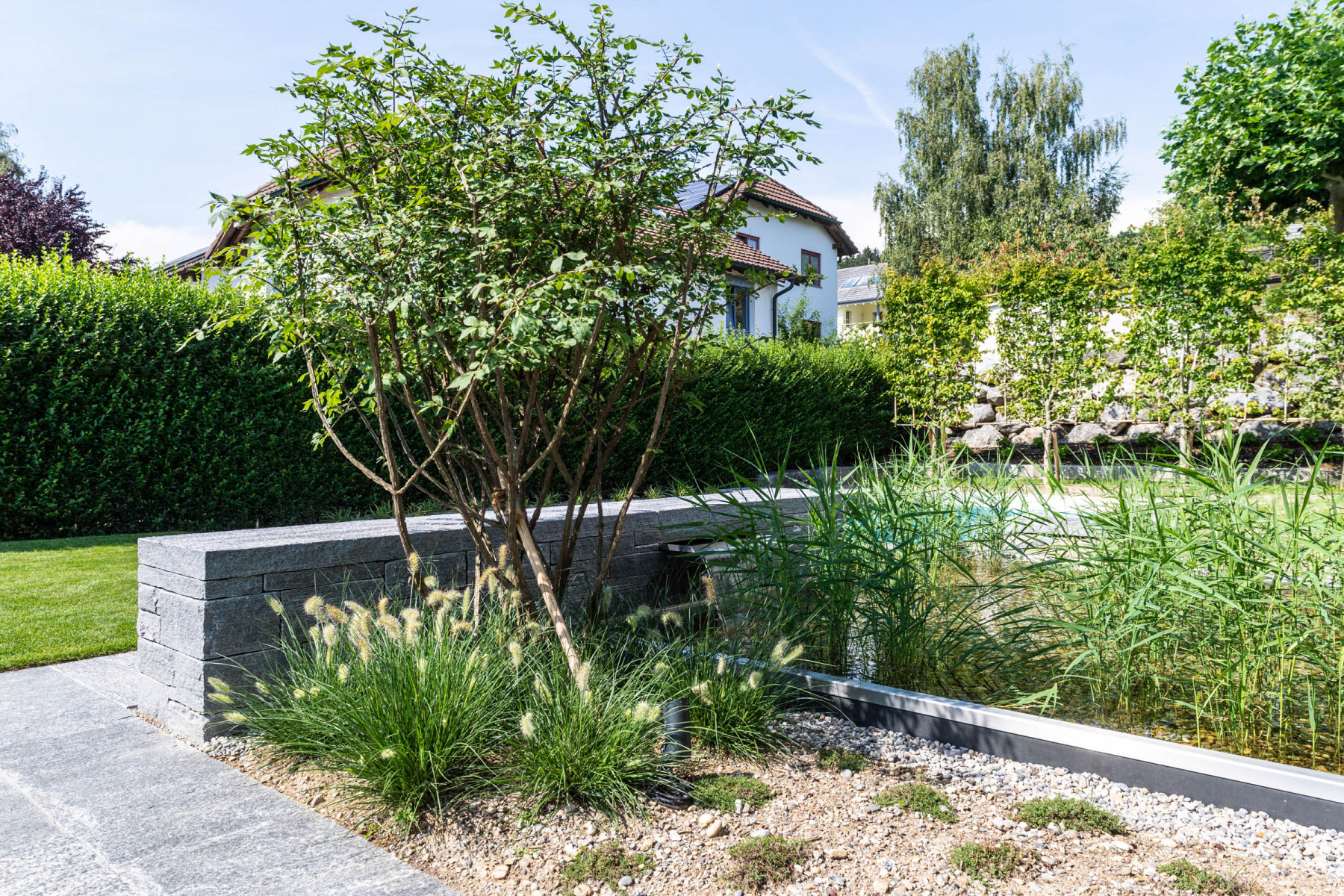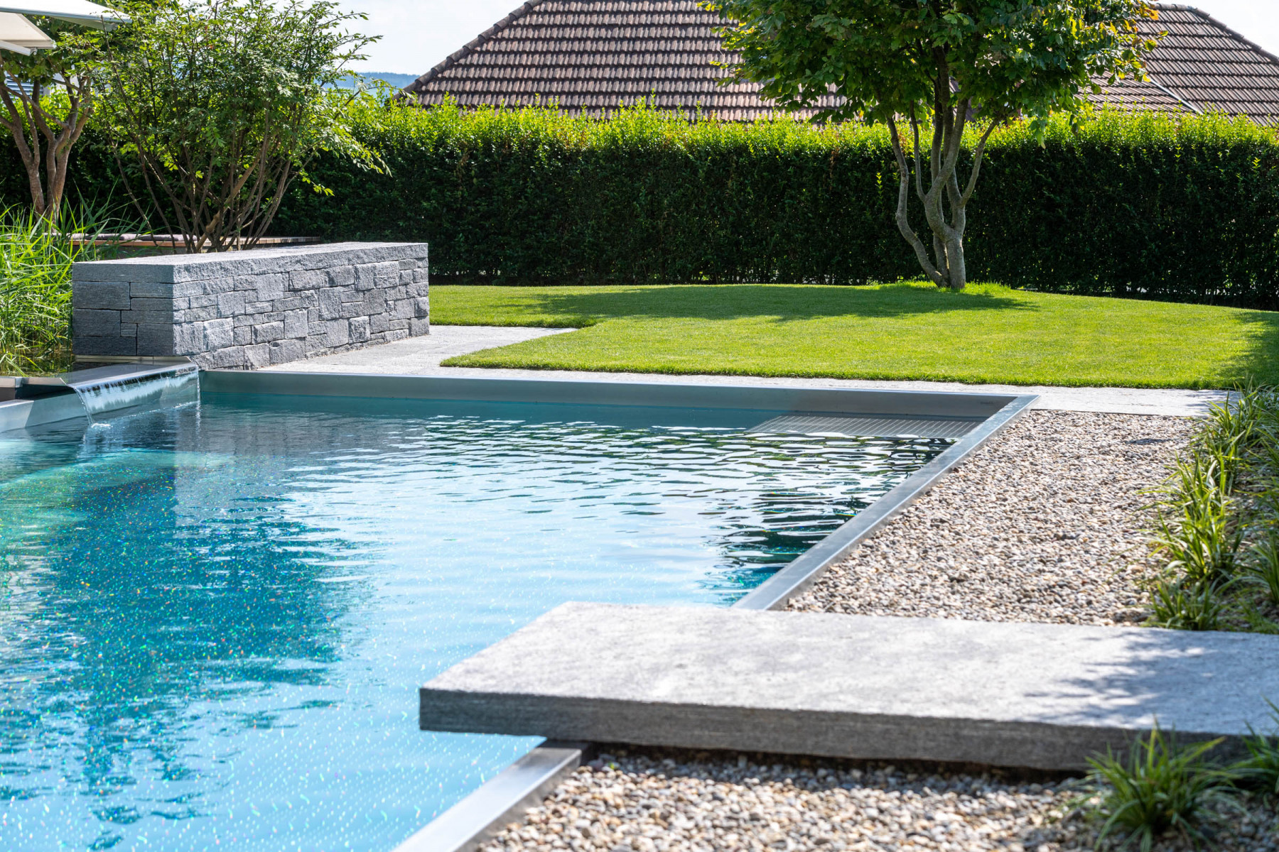 Einige Wochen später werden der neue Pool und der Garten rege benutzt. Dass es sich um einen ‚frischen‘ Garten handelt, zeigt sich einzig an den noch kleinen Stauden und teilweise lockeren Gehölzen. Schauen wir doch nach zwei, drei Jahren nochmals rein.