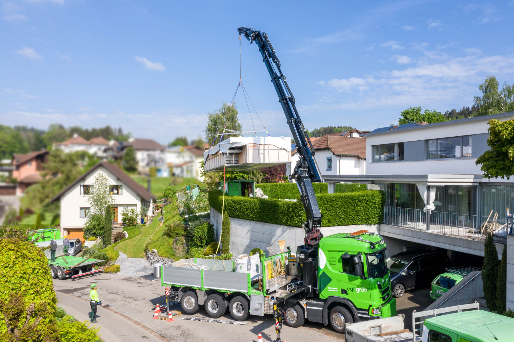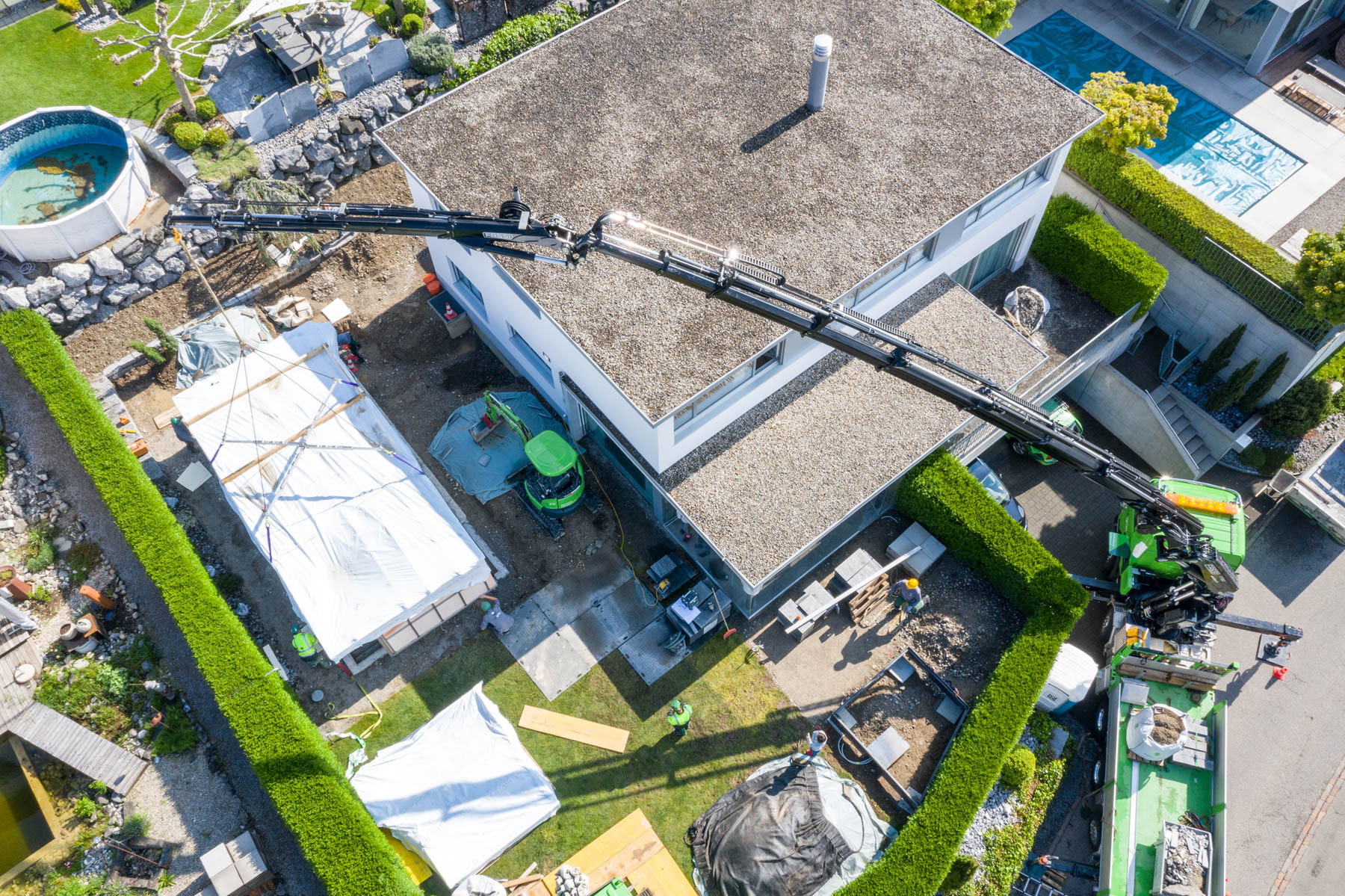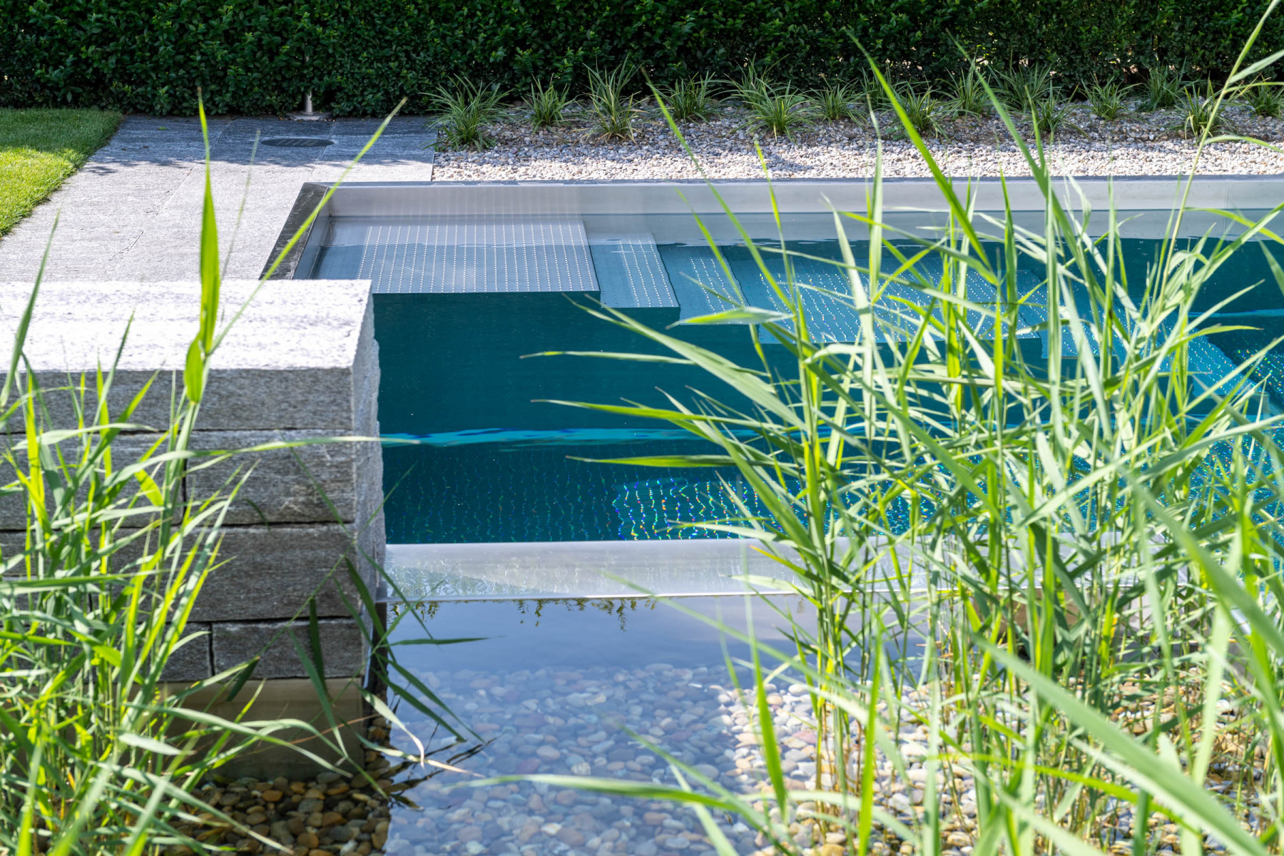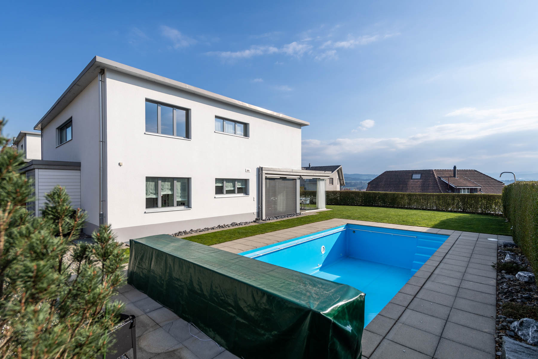 Einige Wochen später werden der neue Pool und der Garten rege benutzt. Dass es sich um einen ‚frischen‘ Garten handelt, zeigt sich einzig an den noch kleinen Stauden und teilweise lockeren Gehölzen. Schauen wir doch nach zwei, drei Jahren nochmals rein.