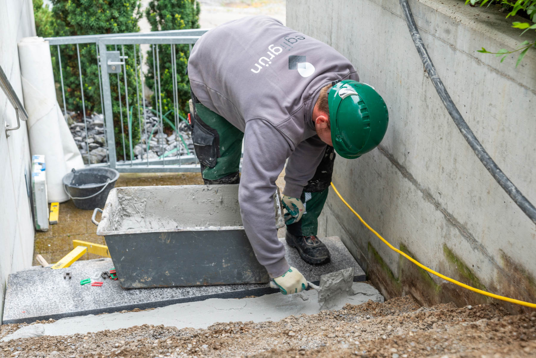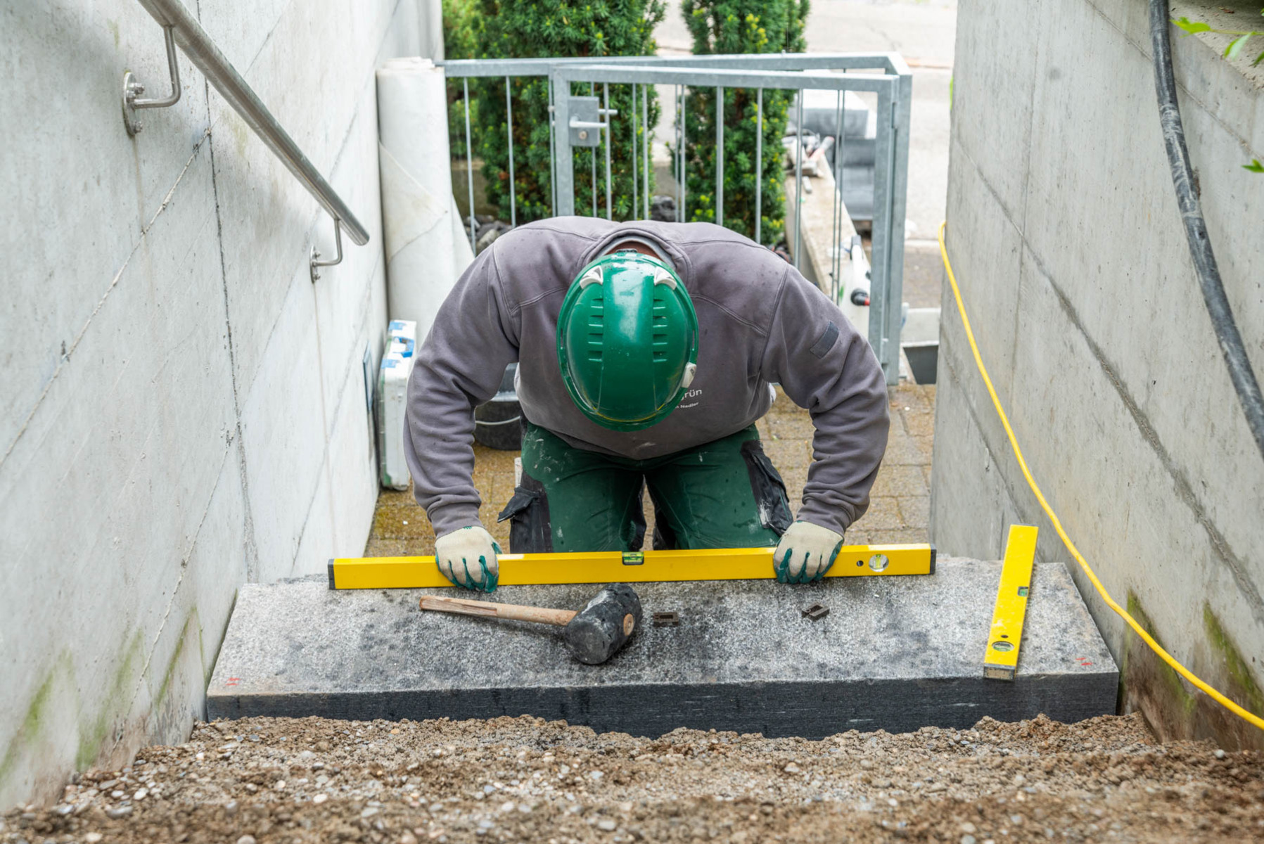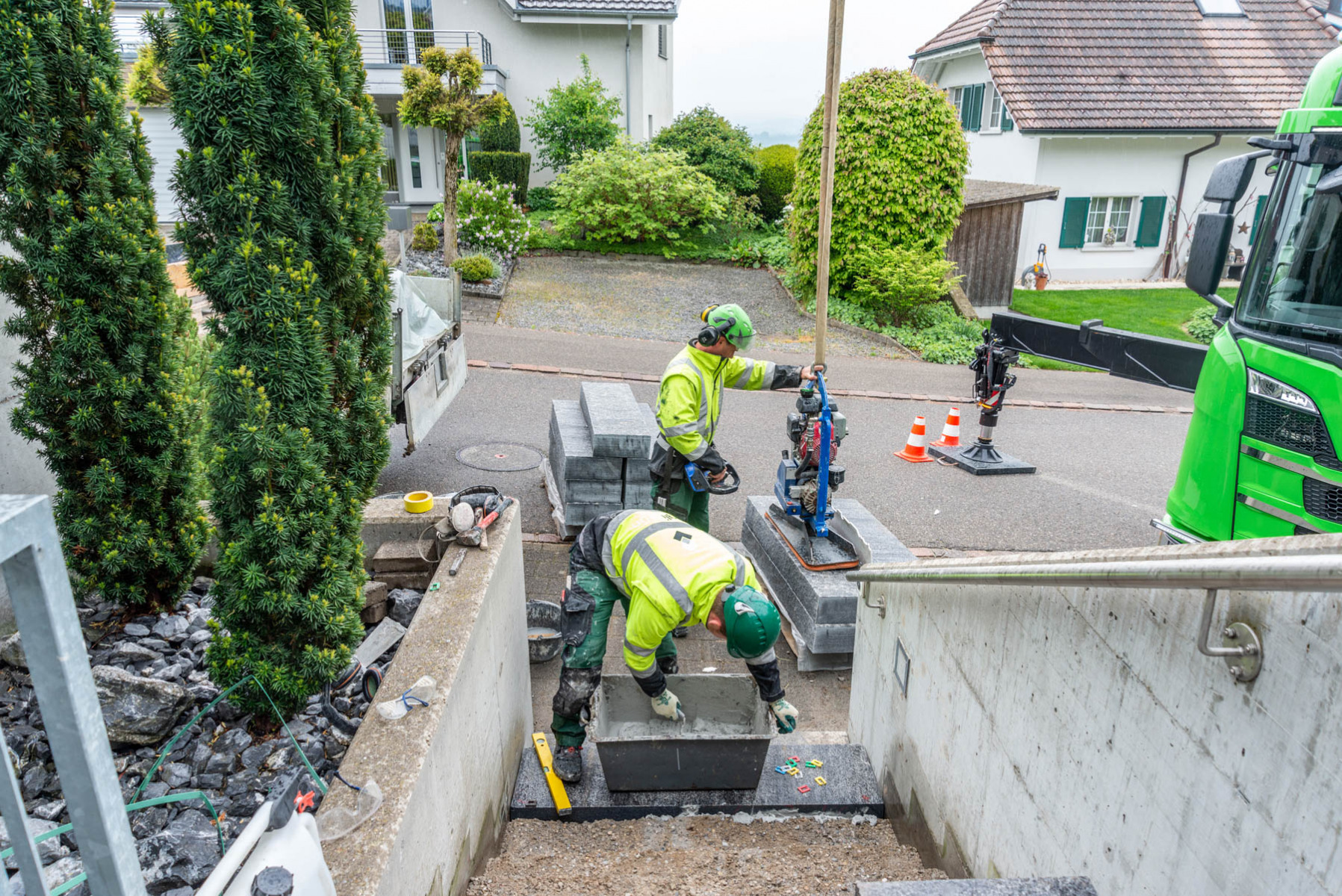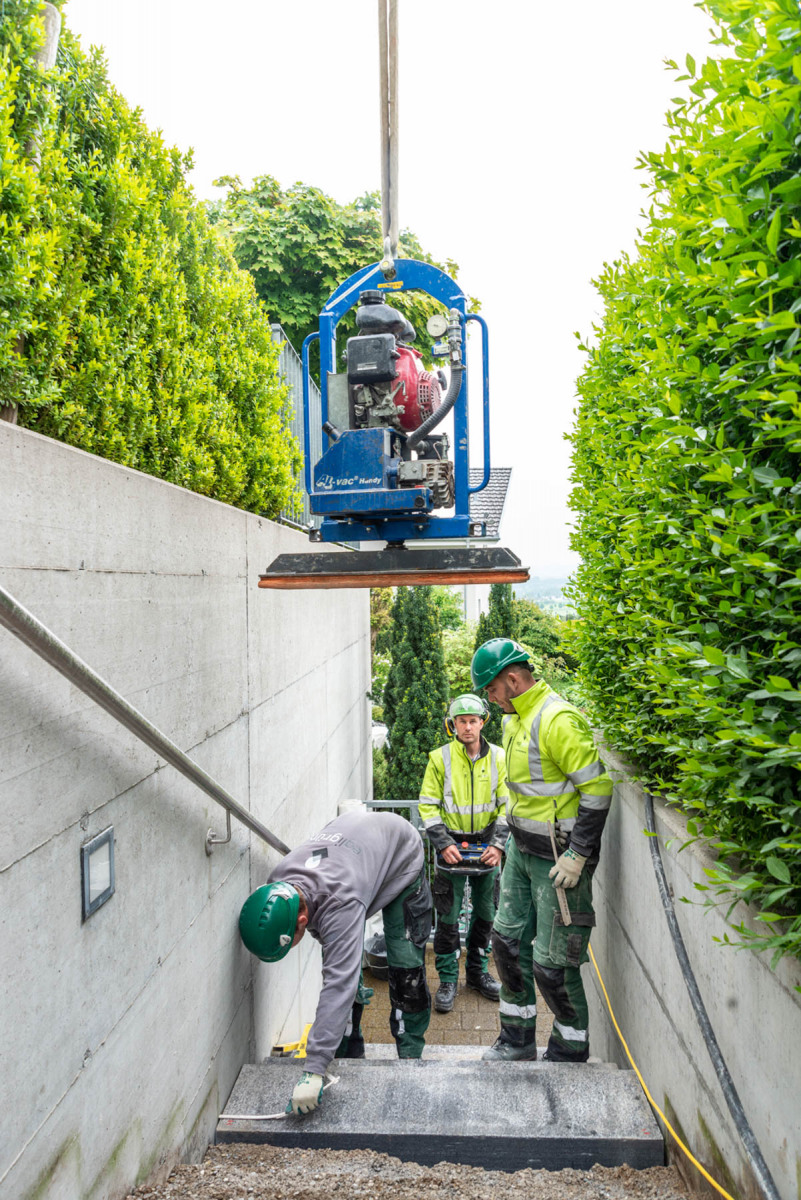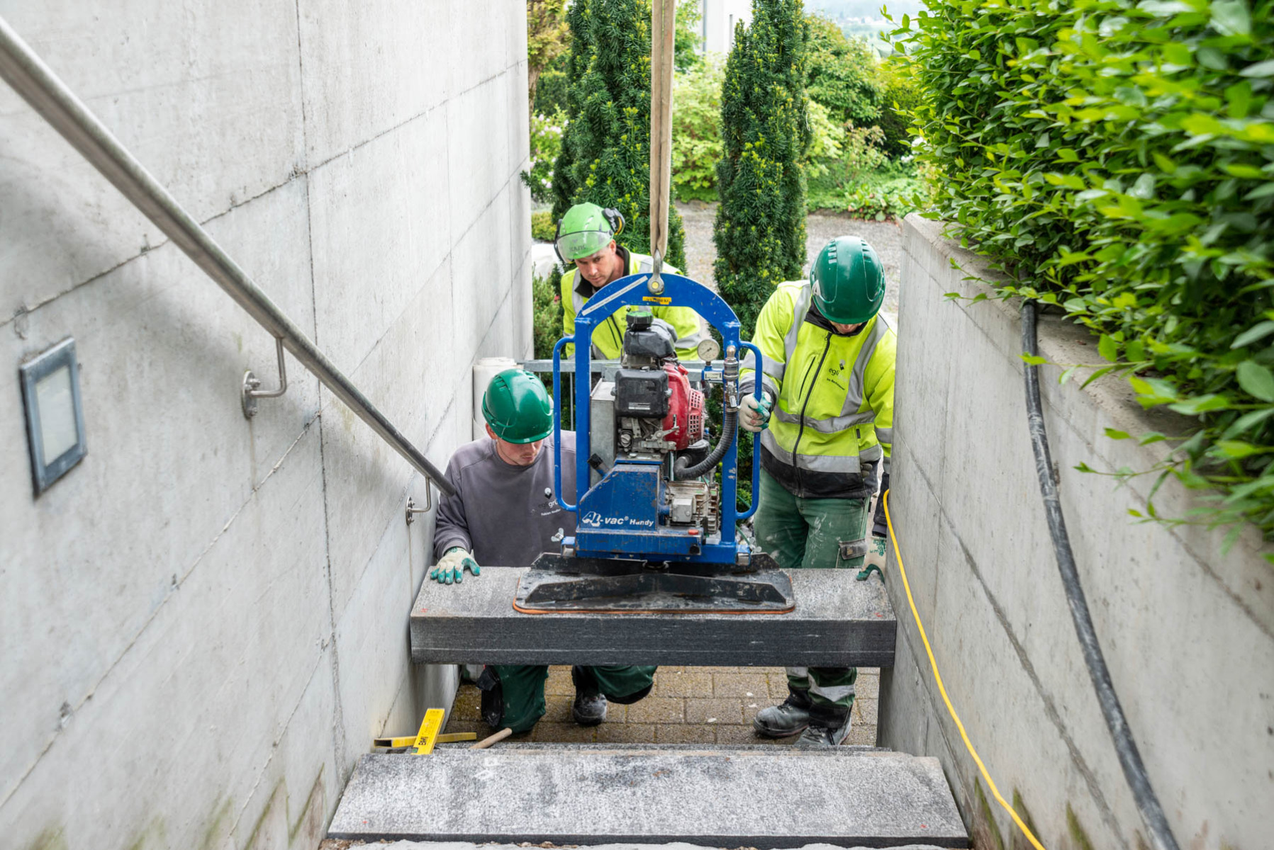 Die alten Betonstufen werden durch Blockstufen aus Calanca-Gneis ersetzt. Das Vakuumgerät leistet dabei unschätzbare Dienste.