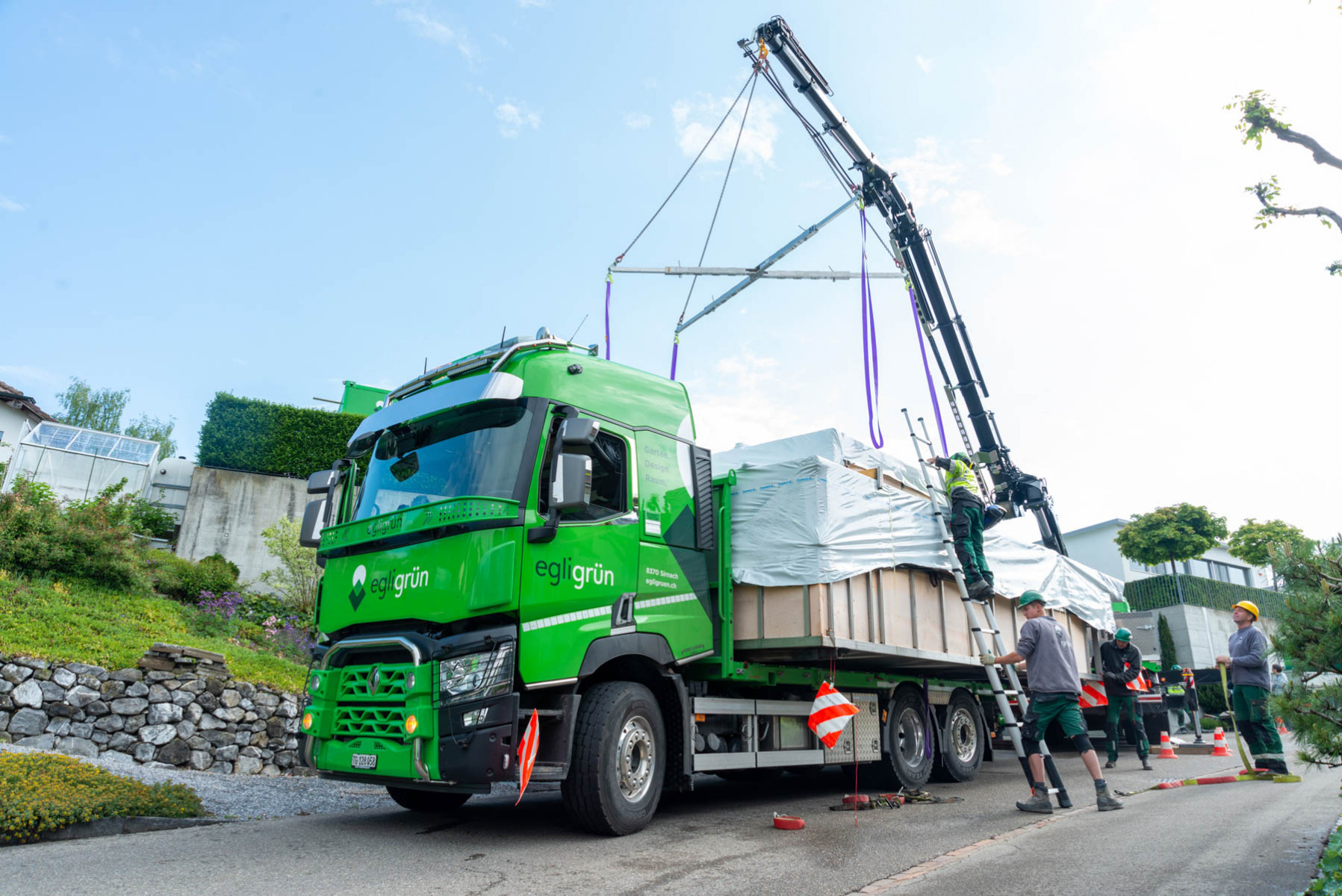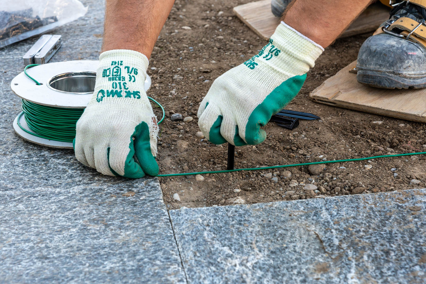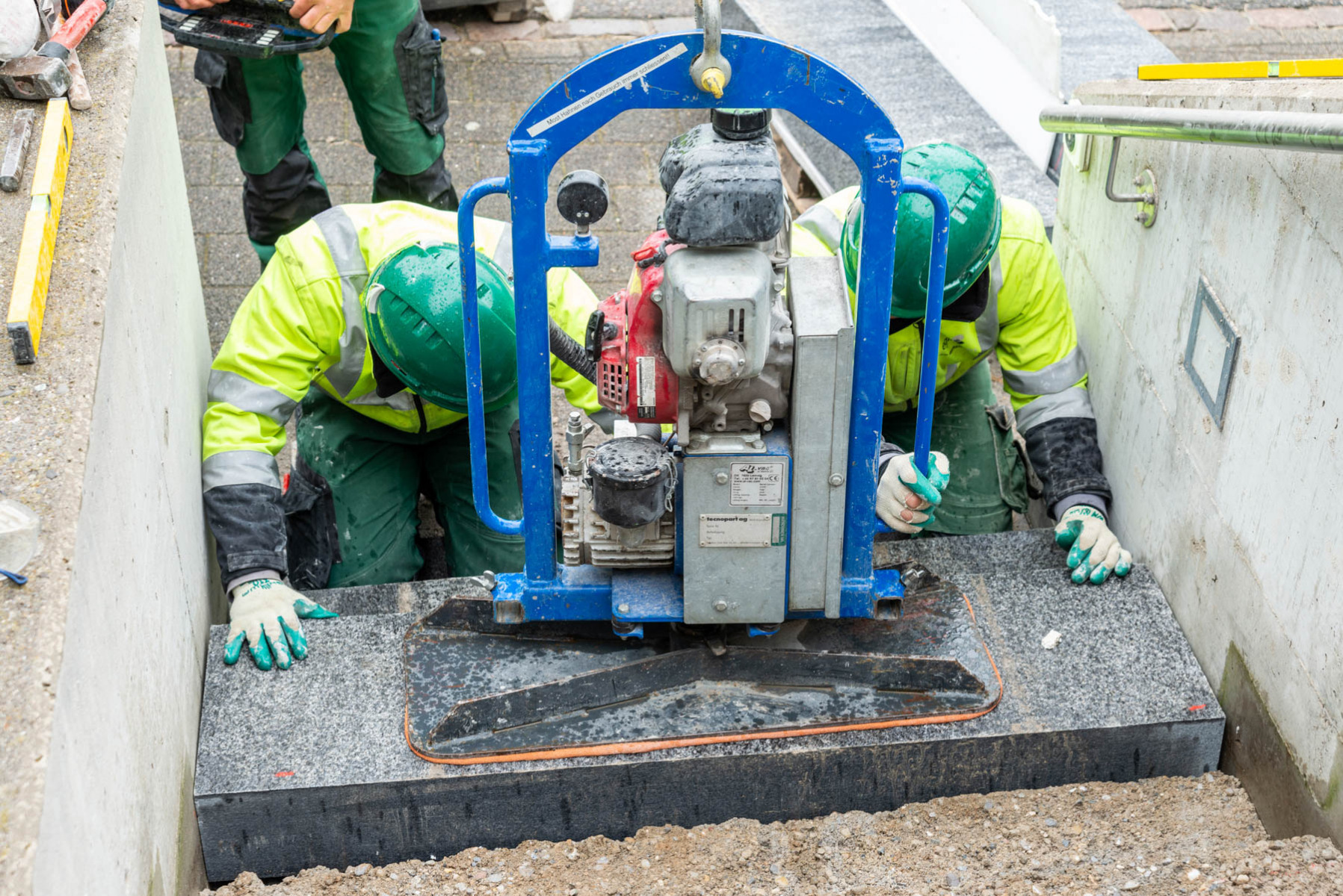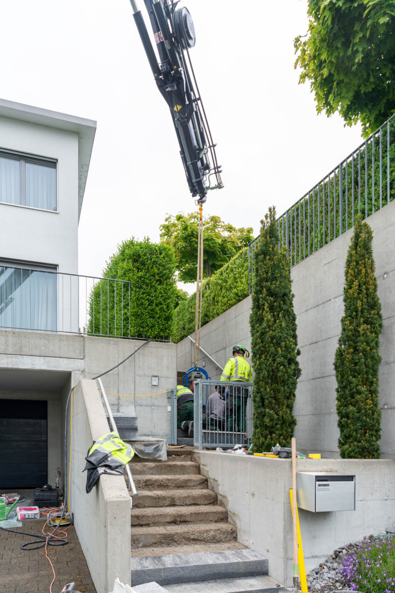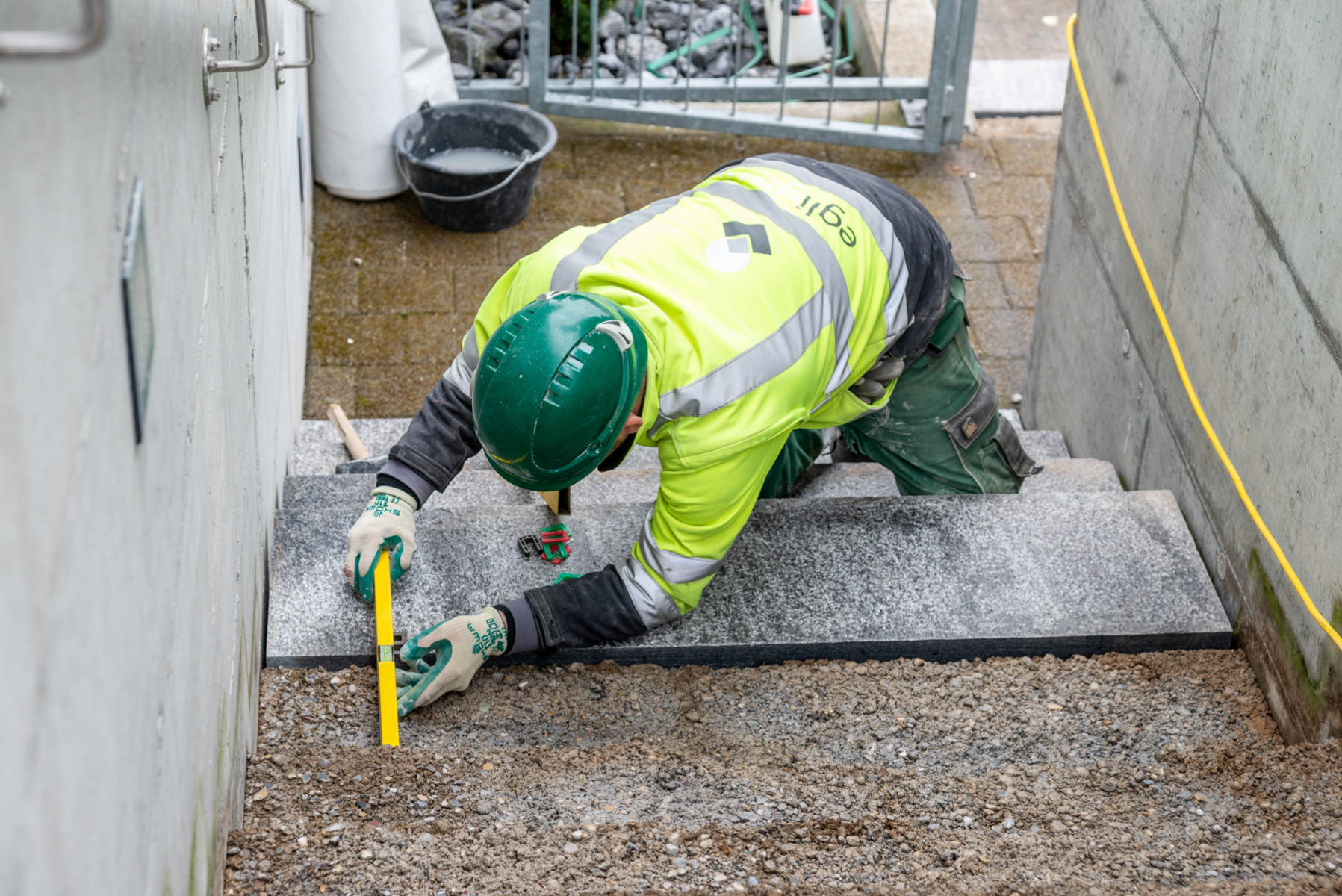 Die alten Betonstufen werden durch Blockstufen aus Calanca-Gneis ersetzt. Das Vakuumgerät leistet dabei unschätzbare Dienste.